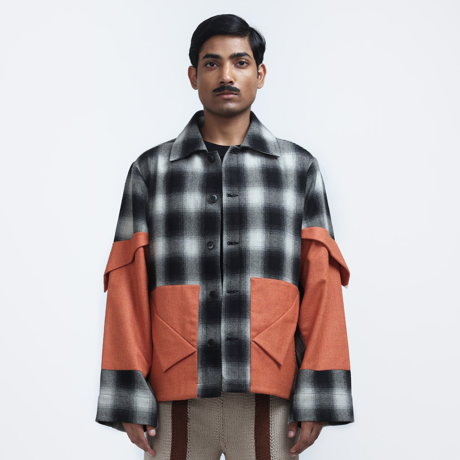 Merino wool jacket with inseam pockets and patch pockets in front, Patch pocket with origami fold, Applique in sleeves with orgami fold, Corozo buttons.