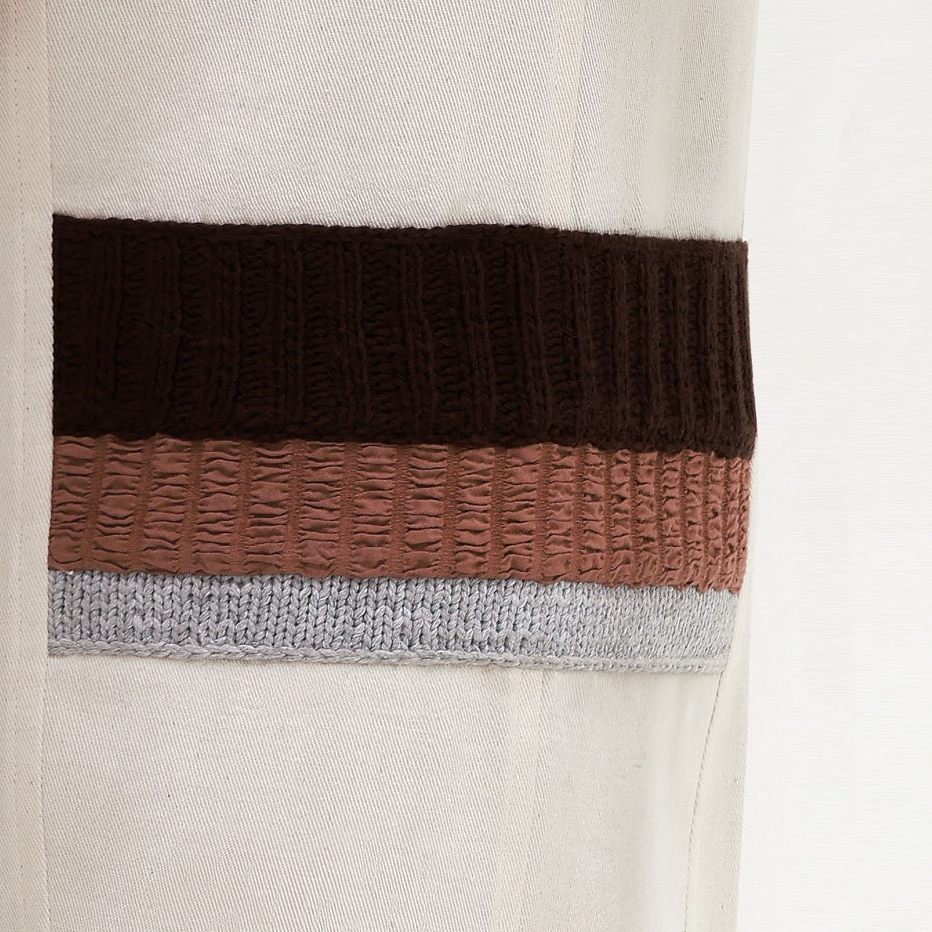 These off-white pants are made from lightweight 100% cotton denim offering comfort and breathability for summer wear. The slant cut pockets in the front provide practicality, while the multi-textured details at the knee, including hand-knitted rib tapes, add a handcrafted touch. A human symbol cut is featured on both the front and back, offering a unique design. The welt pocket at the back adds functionality, and the button fastening in the waistband ensures a secure fit. The edges and cuts are fused to strengthen the seams, making these pants durable for everyday use. A relaxed, straight fit completes the look, ideal for lounging or casual outings.