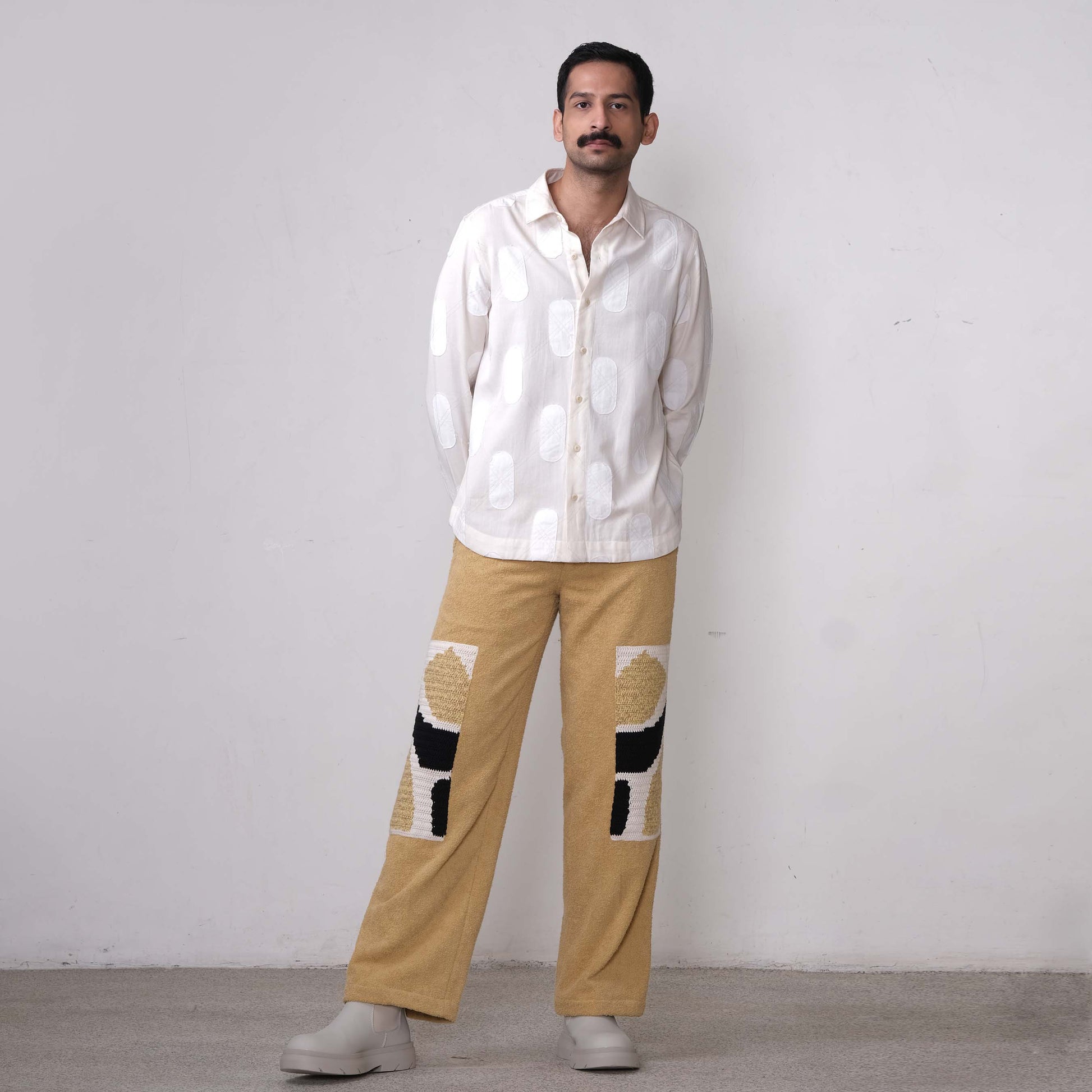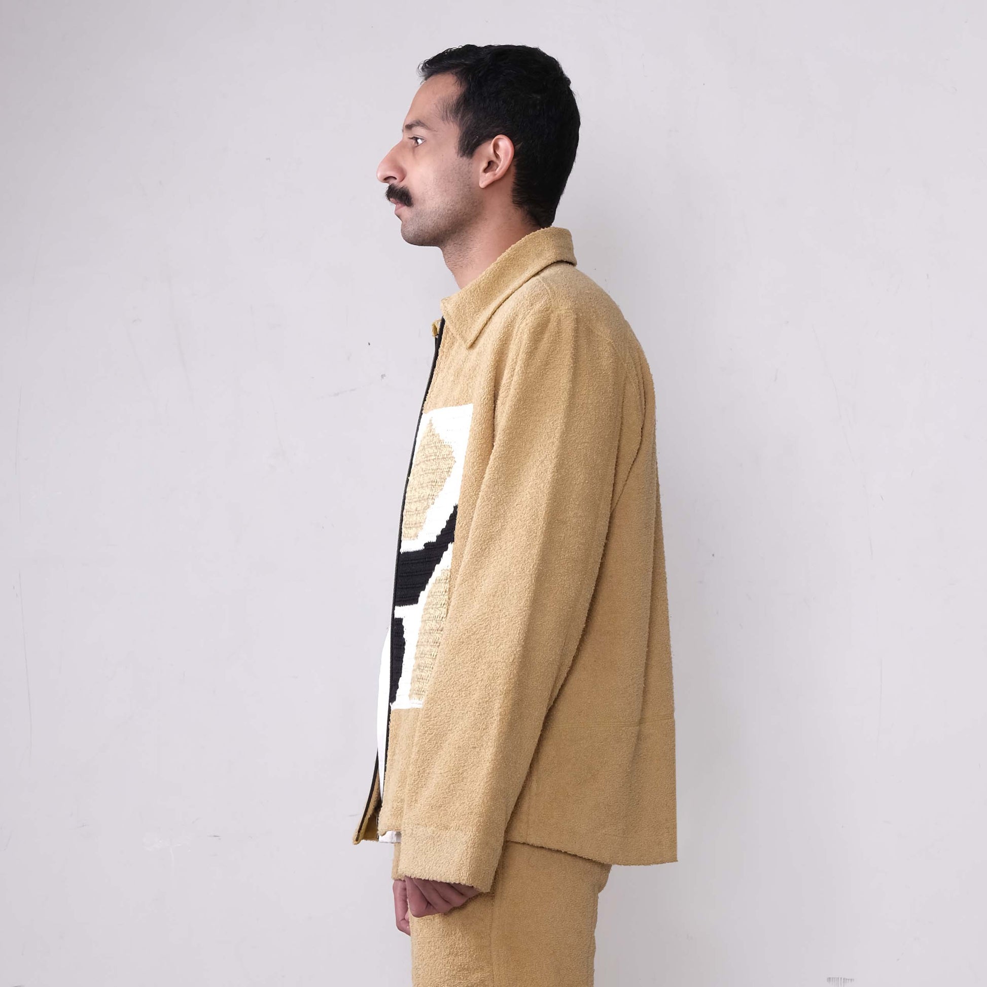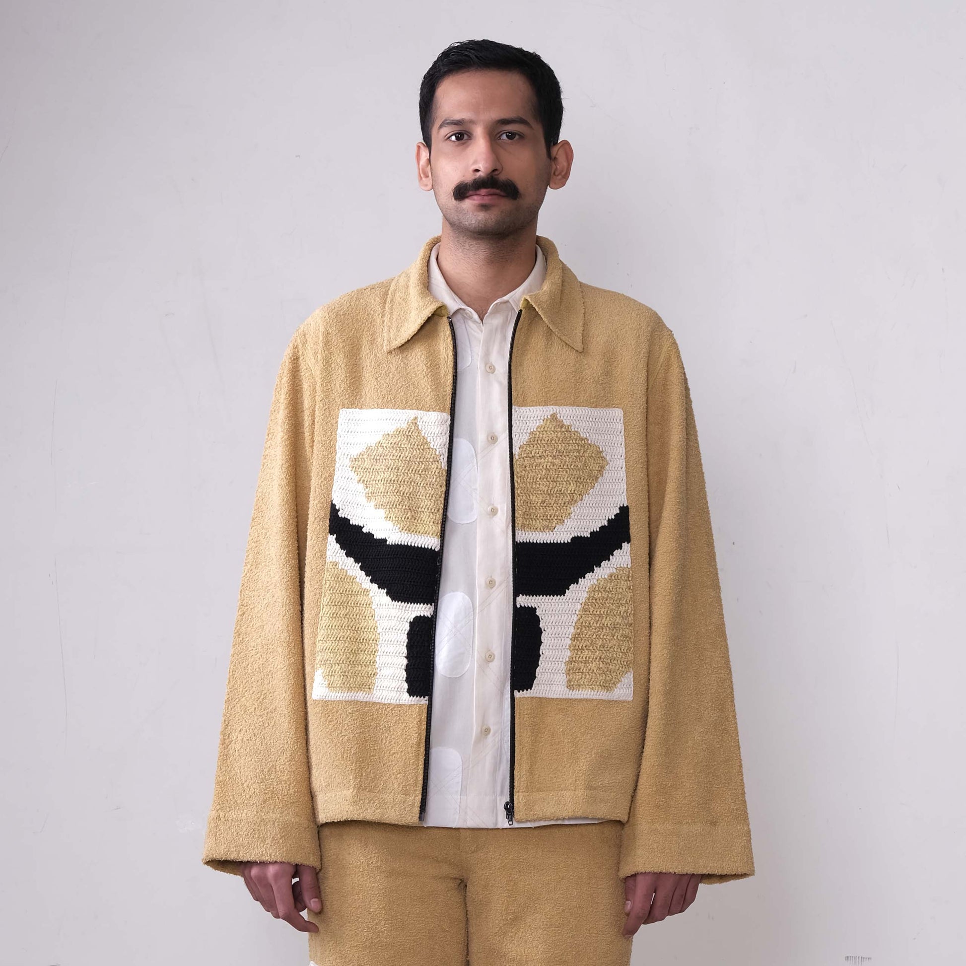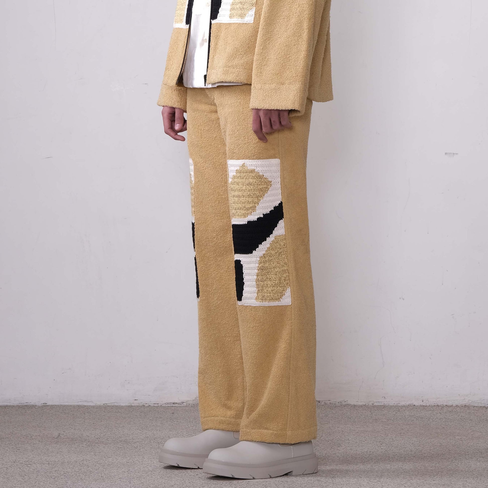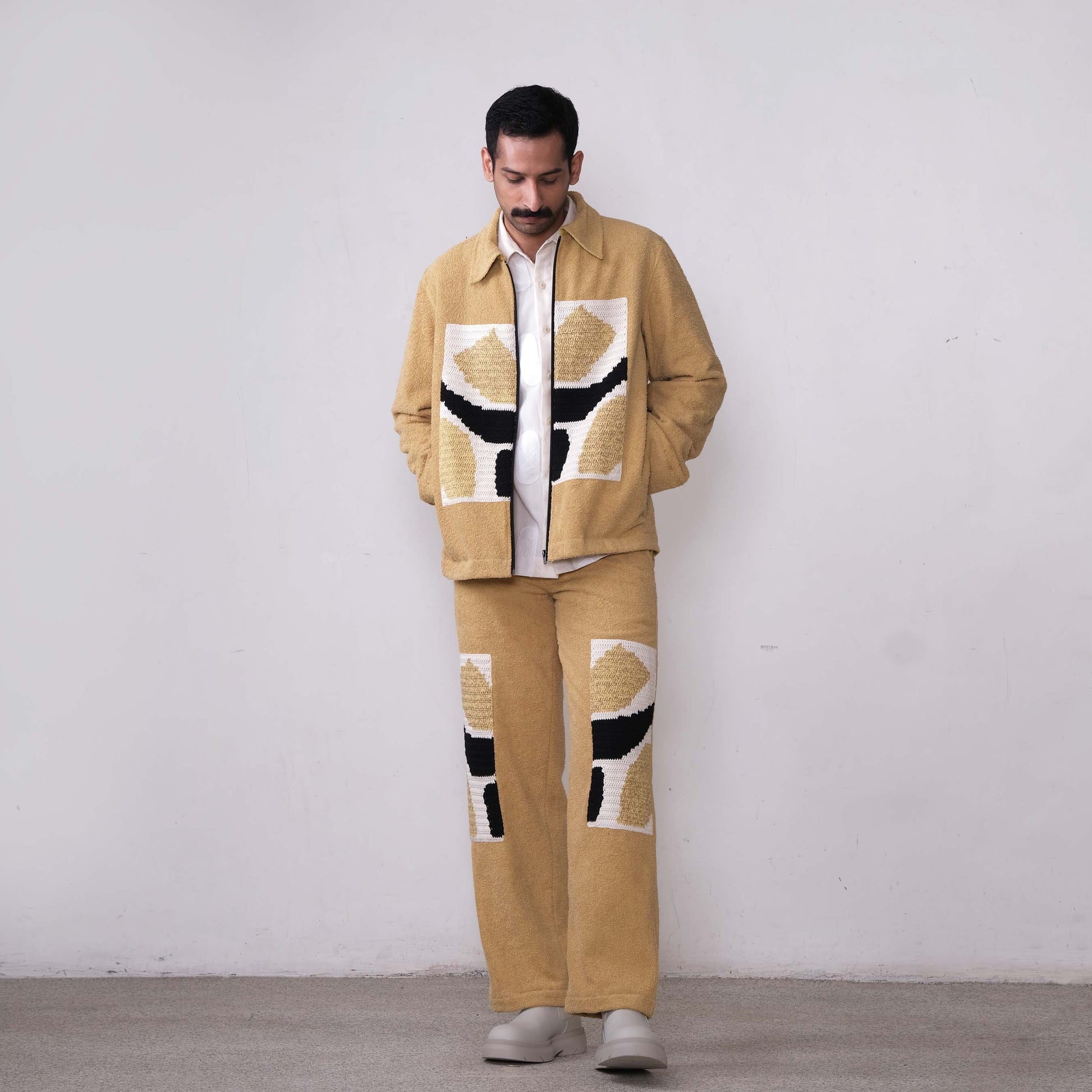 Natural dyed organic cotton terry jacket and trouser with hand crocheted applique, Gaji silk lining.