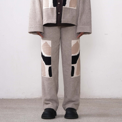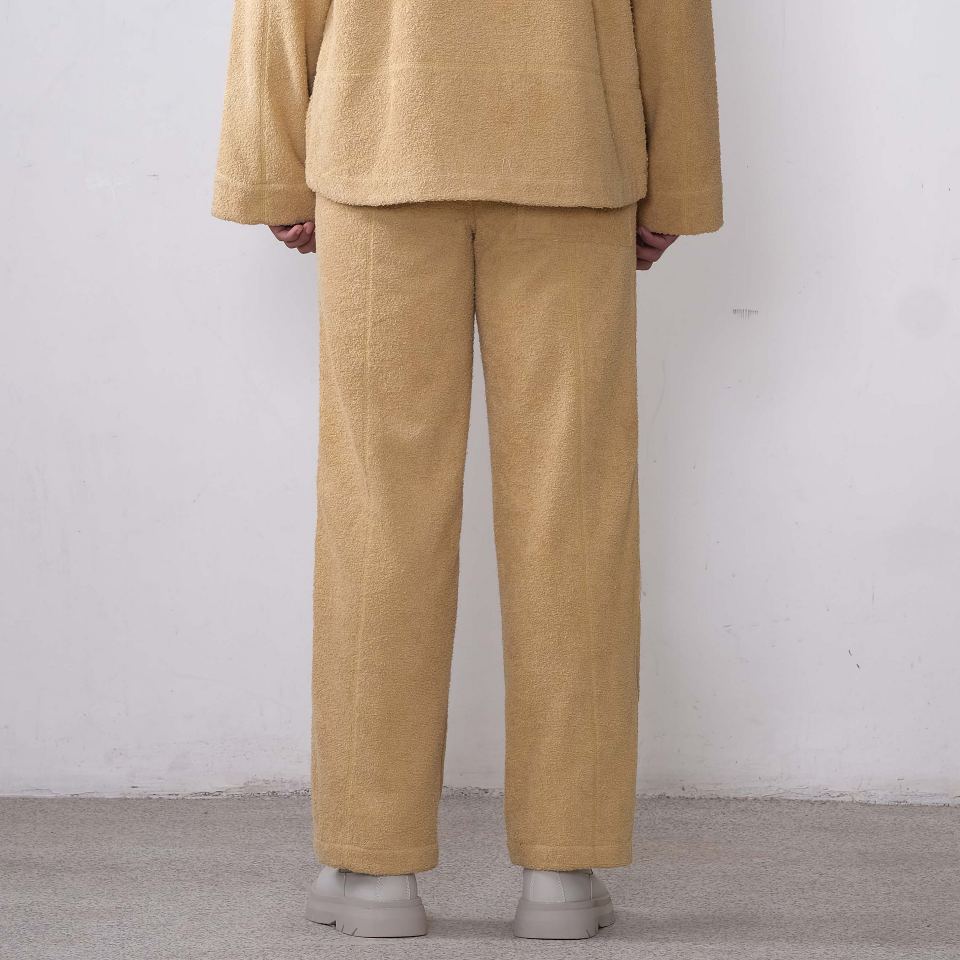 Naturally dyed organic cotton terry, Symbolic hand-crocheted patches in front, Flatlock stitch details, Cotton silk lining, Fly zipper opening in front.
