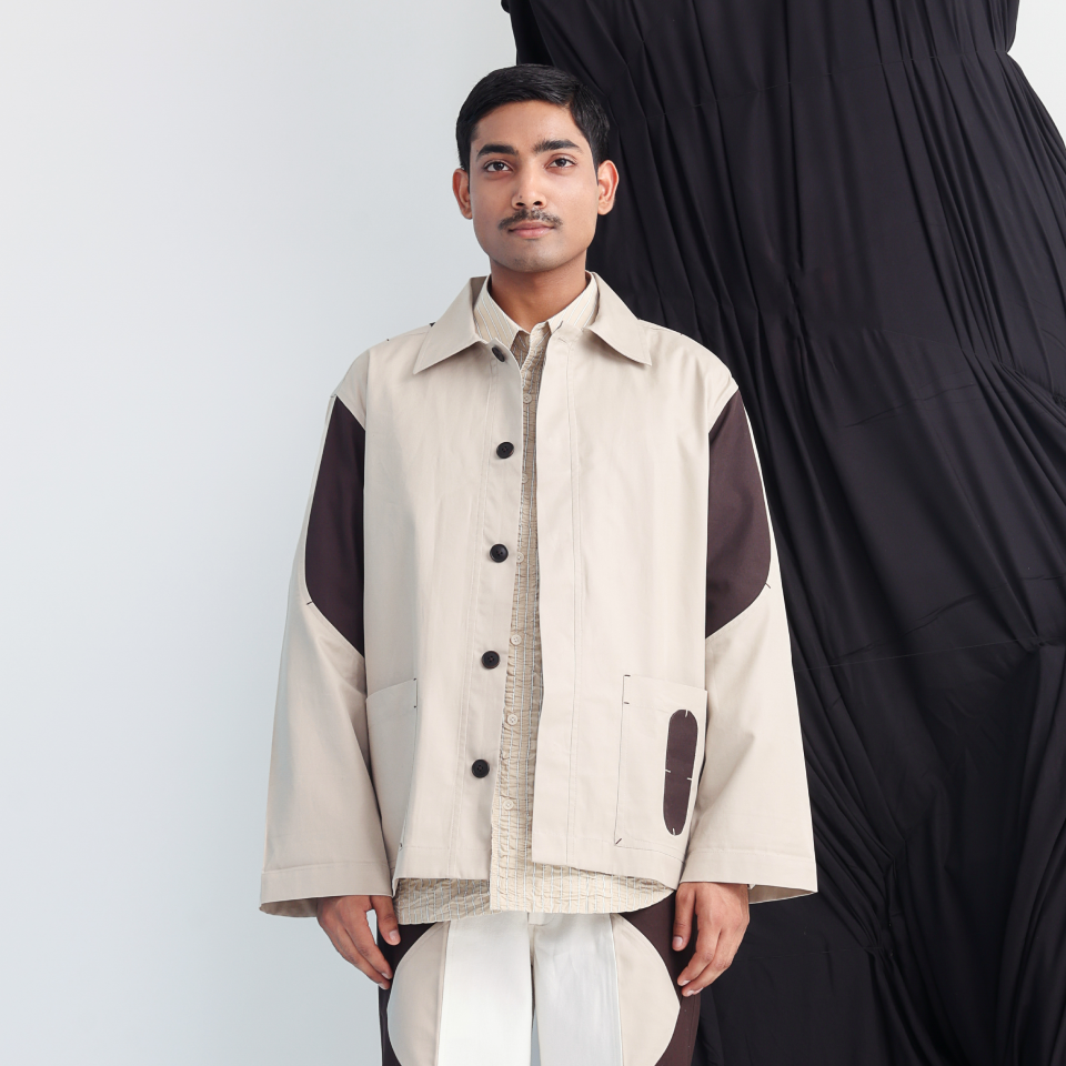 Symbolic Brown panels, Patch pockets in front, Human Symbol patch on pocket, Hand tack details all over.