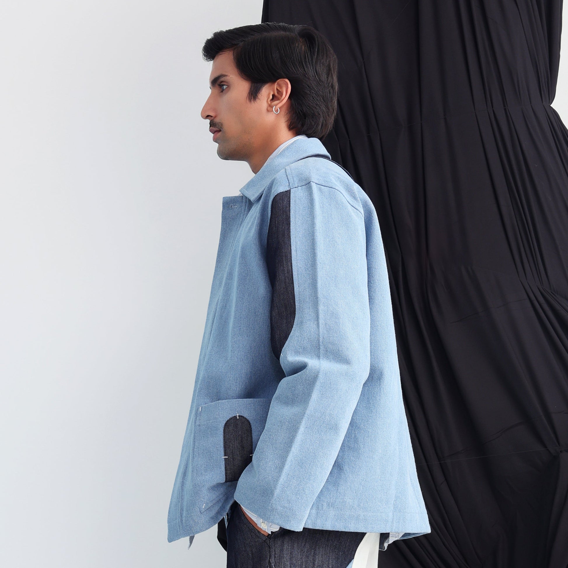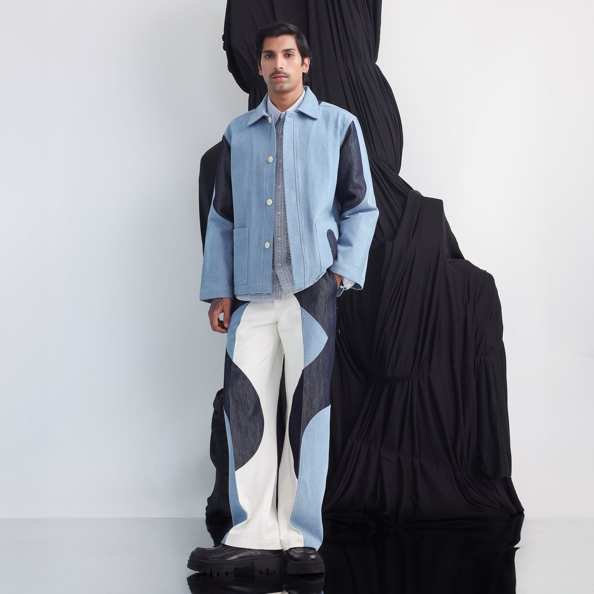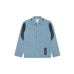 Symbolic navy blue panels, Patch pockets in front, Human Symbol applique on patch pockets, Bartack details all over.