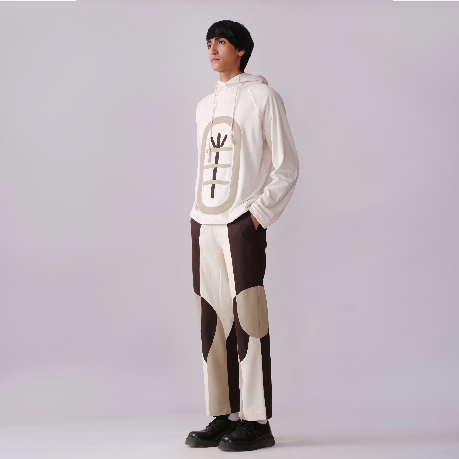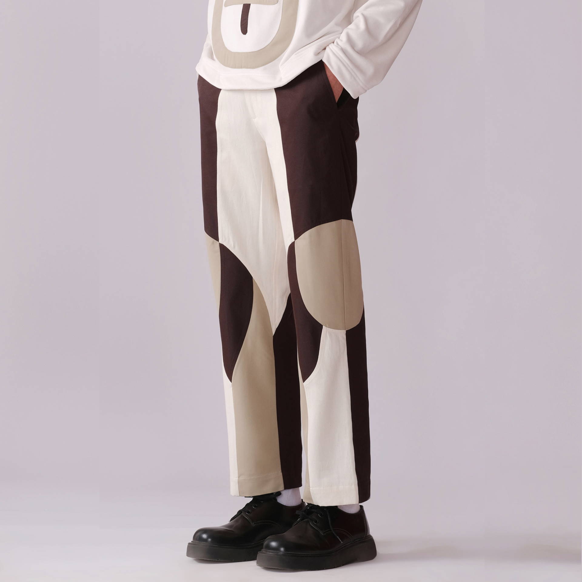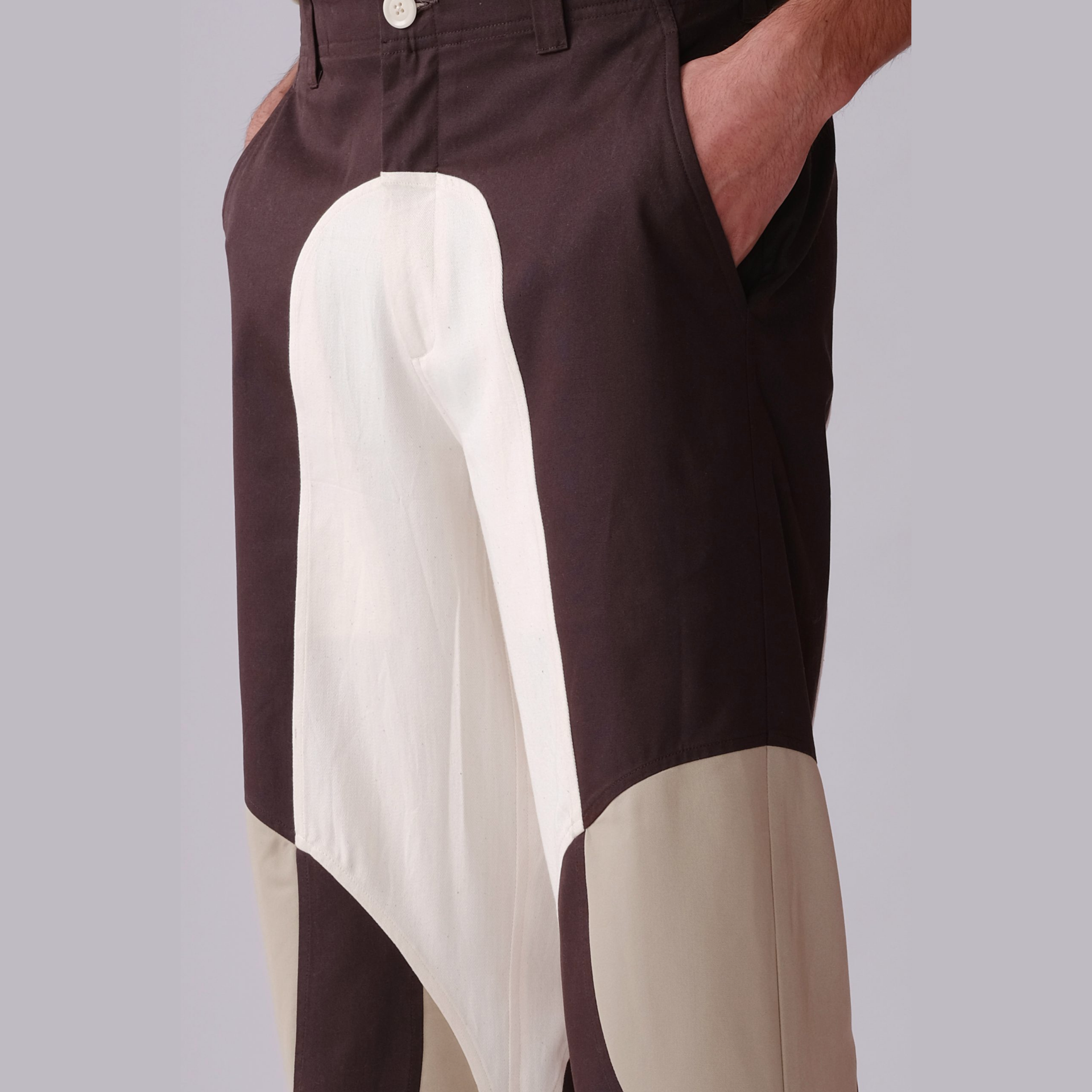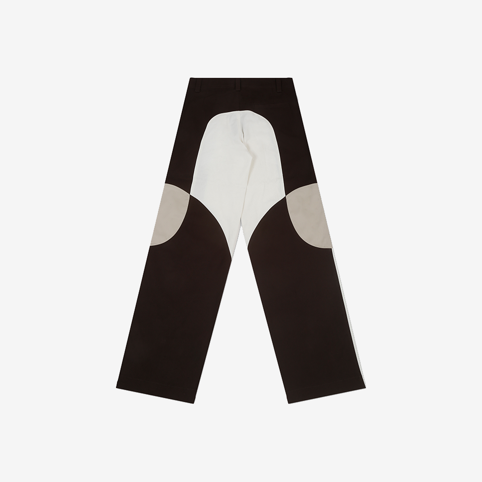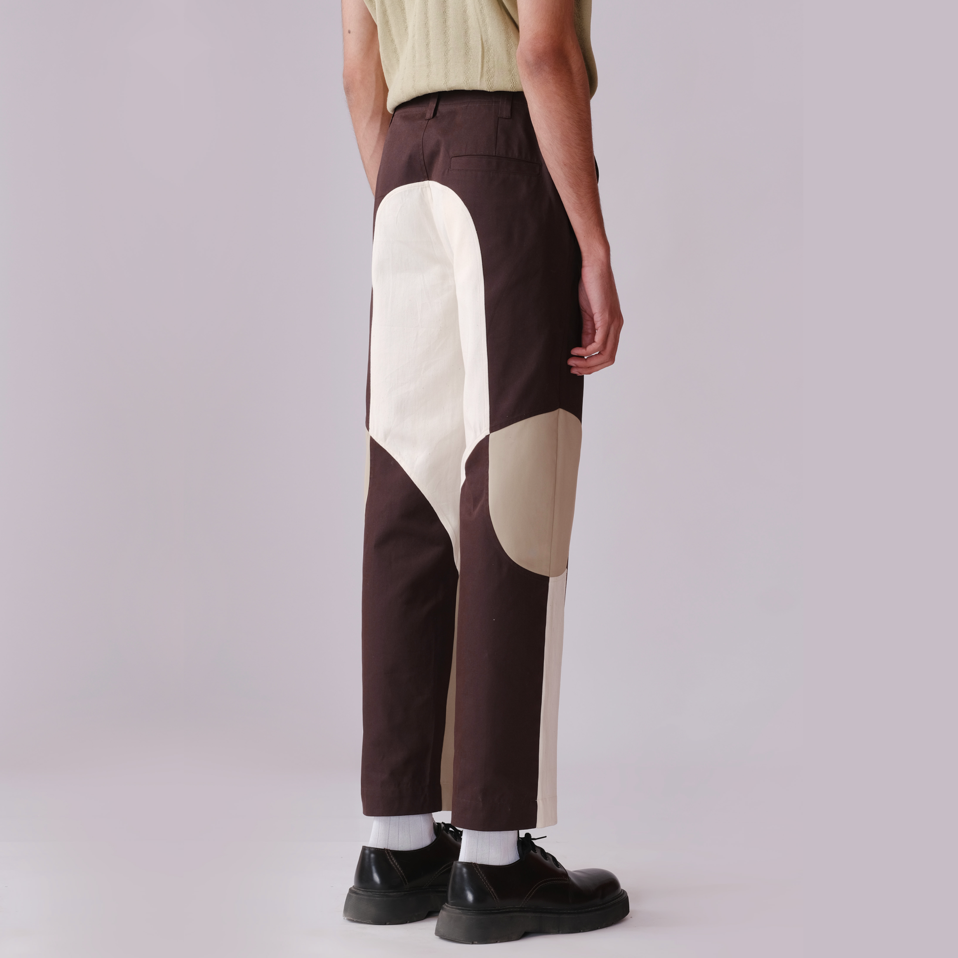 Panelled construction, Top stitch on panels, Corozo button, Continuous waistband, Slant pockets.