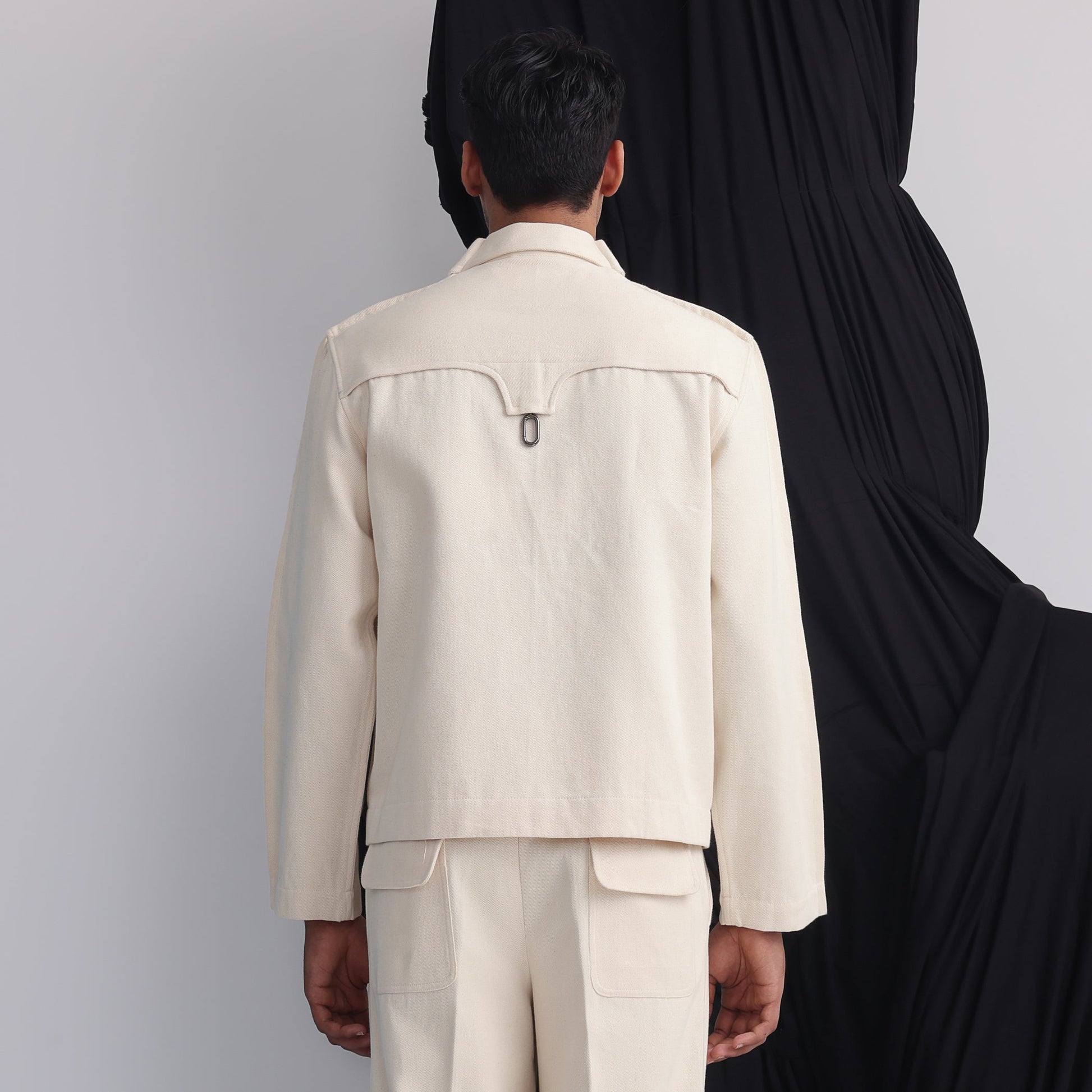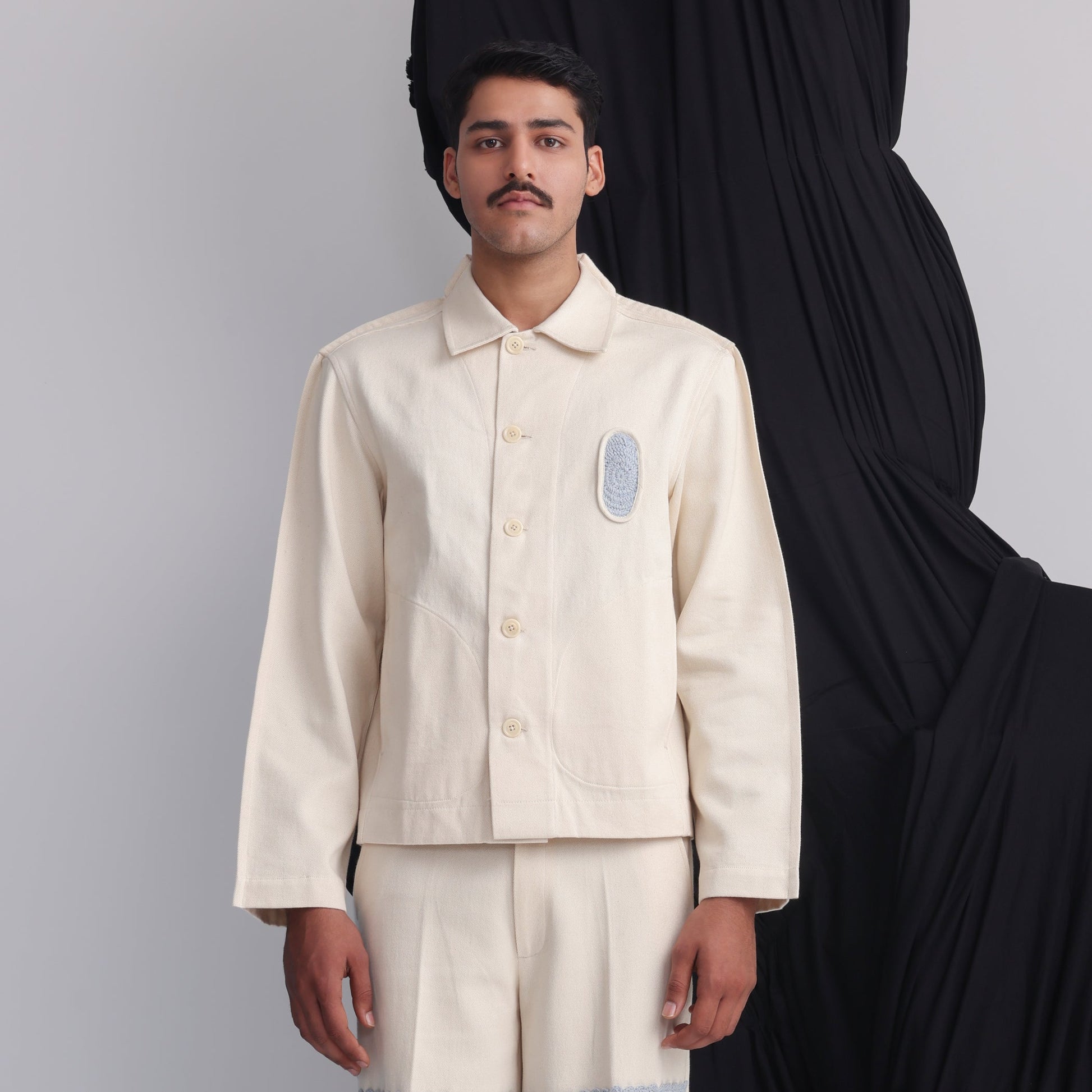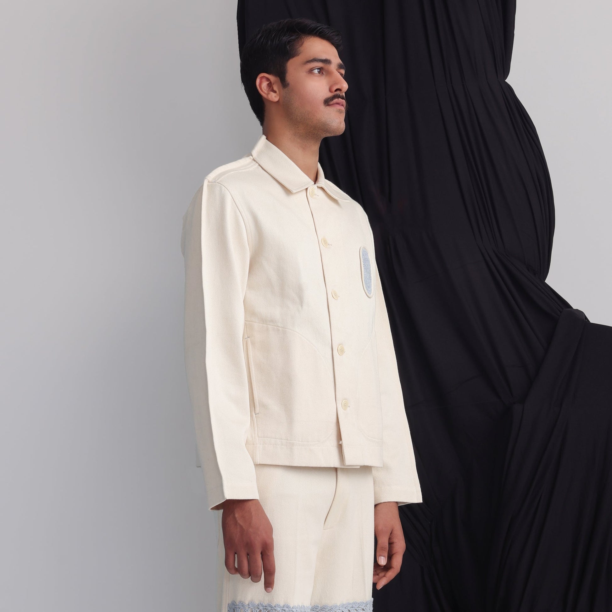 Extra margin detail running from shoulder to sleeves, Bartack details all over, Human symbol crochet applique on left chest, Side pockets, Full sleeves, Signature human symbol metal hook attached to yoke at across back.