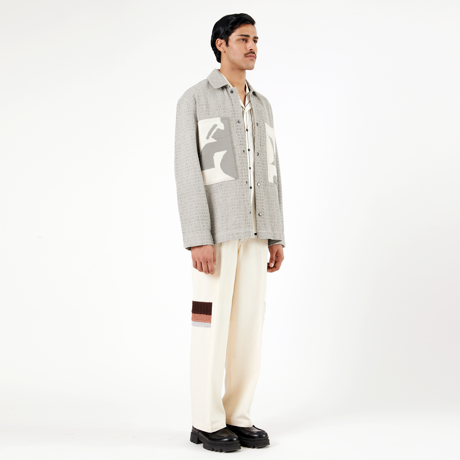 Snap button fastening, side seam pockets, and hand-knitted intarsia patches add quiet detail.