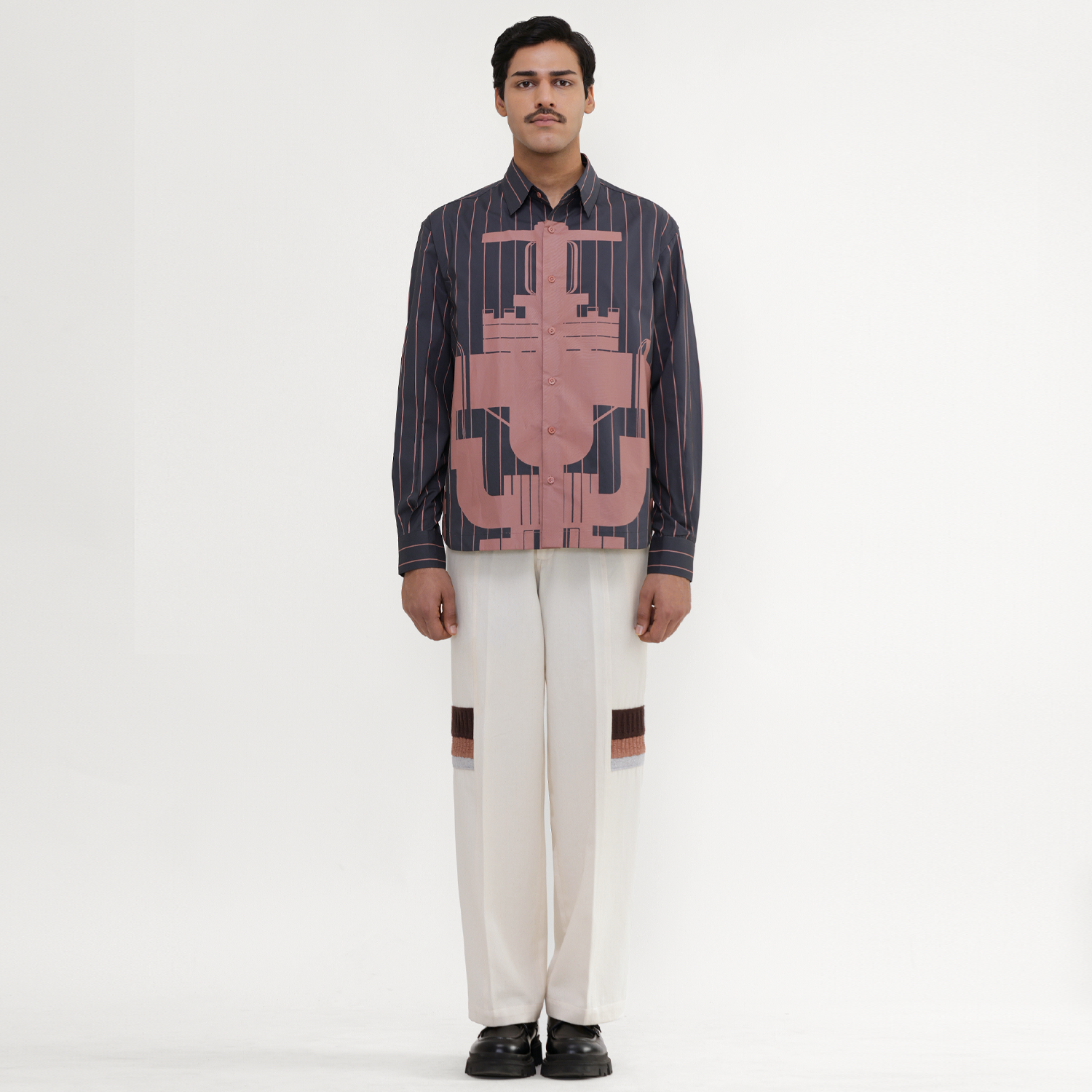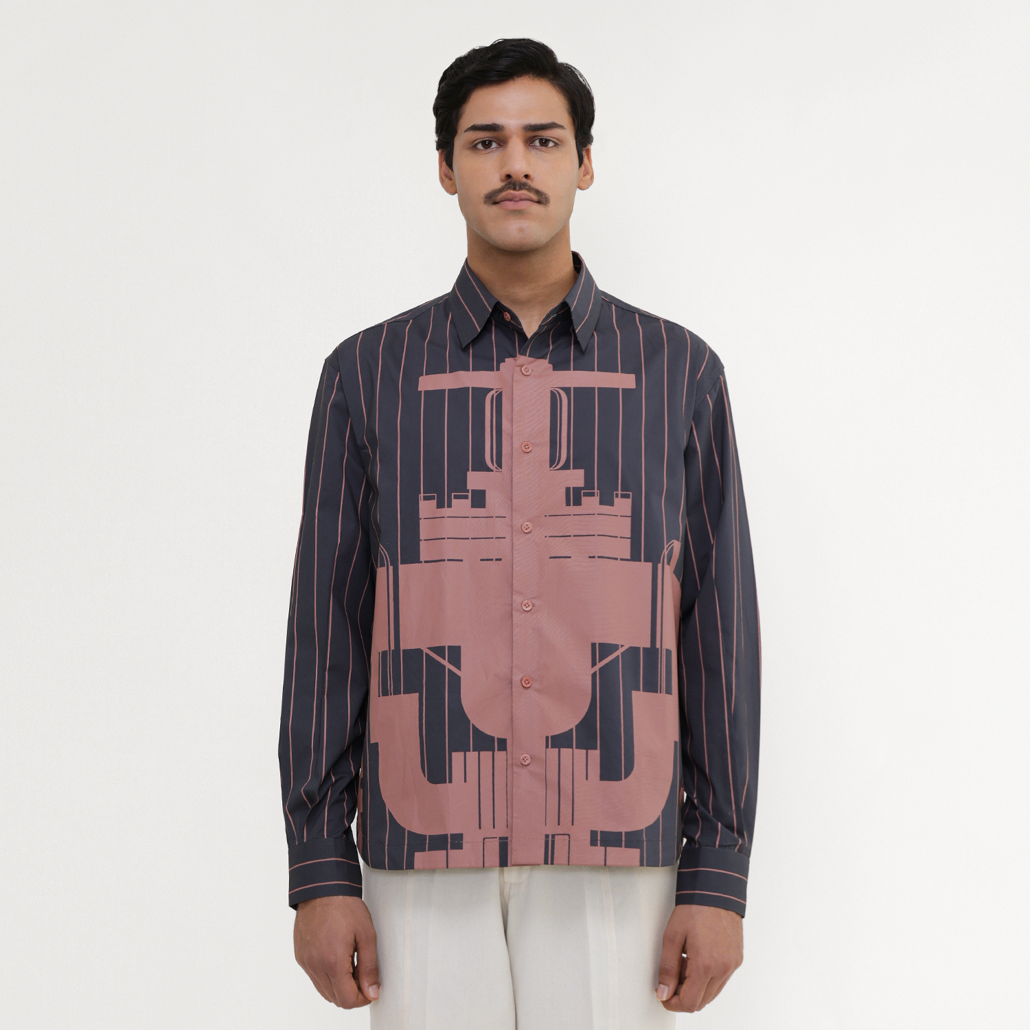 Made from lightweight cotton poplin, this grey shirt features a relaxed fit and full sleeves. The screen-printed symbolic pattern of Spring Summer 25 is paired with screen-printed pinstripes for a modern touch. The curved hem on the sides adds a distinctive finish, with corozo buttons completing the design.