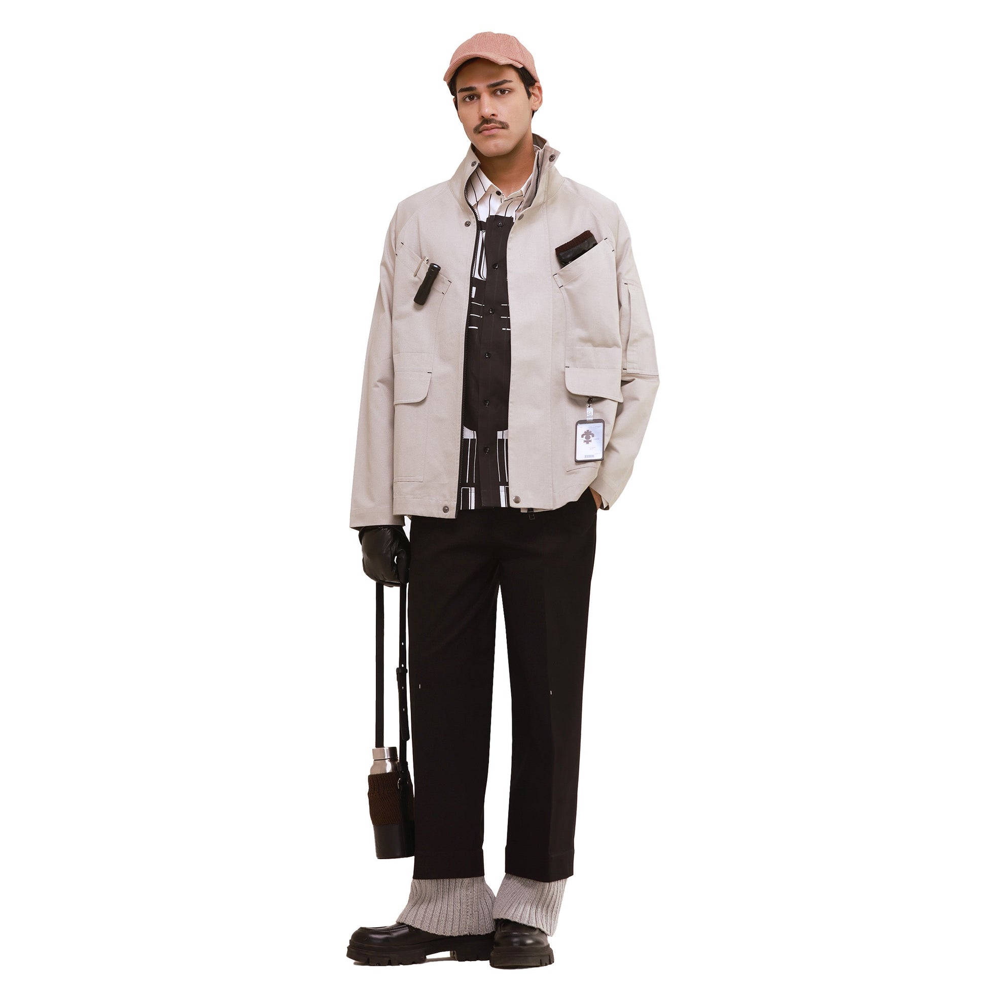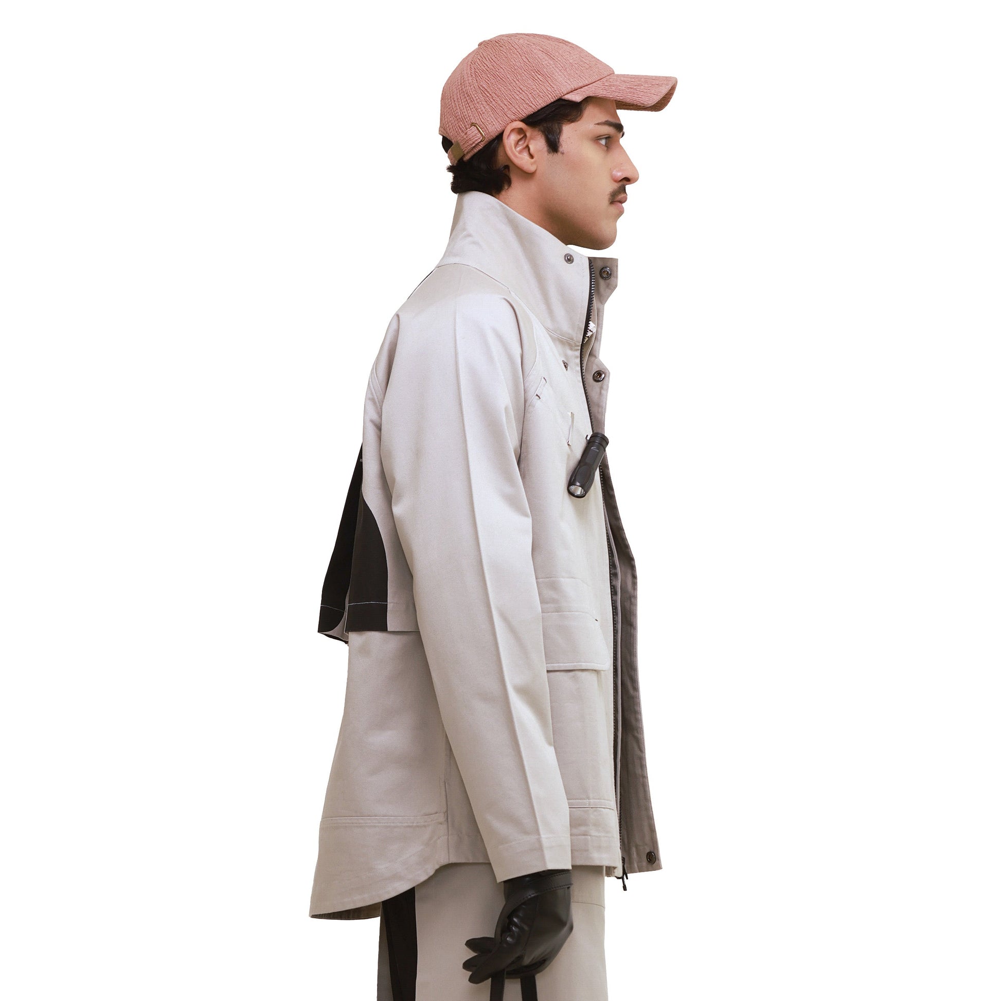 This cotton twill jacket is our reinterpretation of classic utility wear, featuring elbow-shaped chest pockets that flow into flap pockets, side seam pockets, and a bicep patch pocket for added function. Designed for movement with raglan sleeves, it includes a sweat panel at the back screen-printed with a gate valve motif. Zipper fastening with snap buttons, contrast bartack details, and practical layering make it an ideal travel jacket.