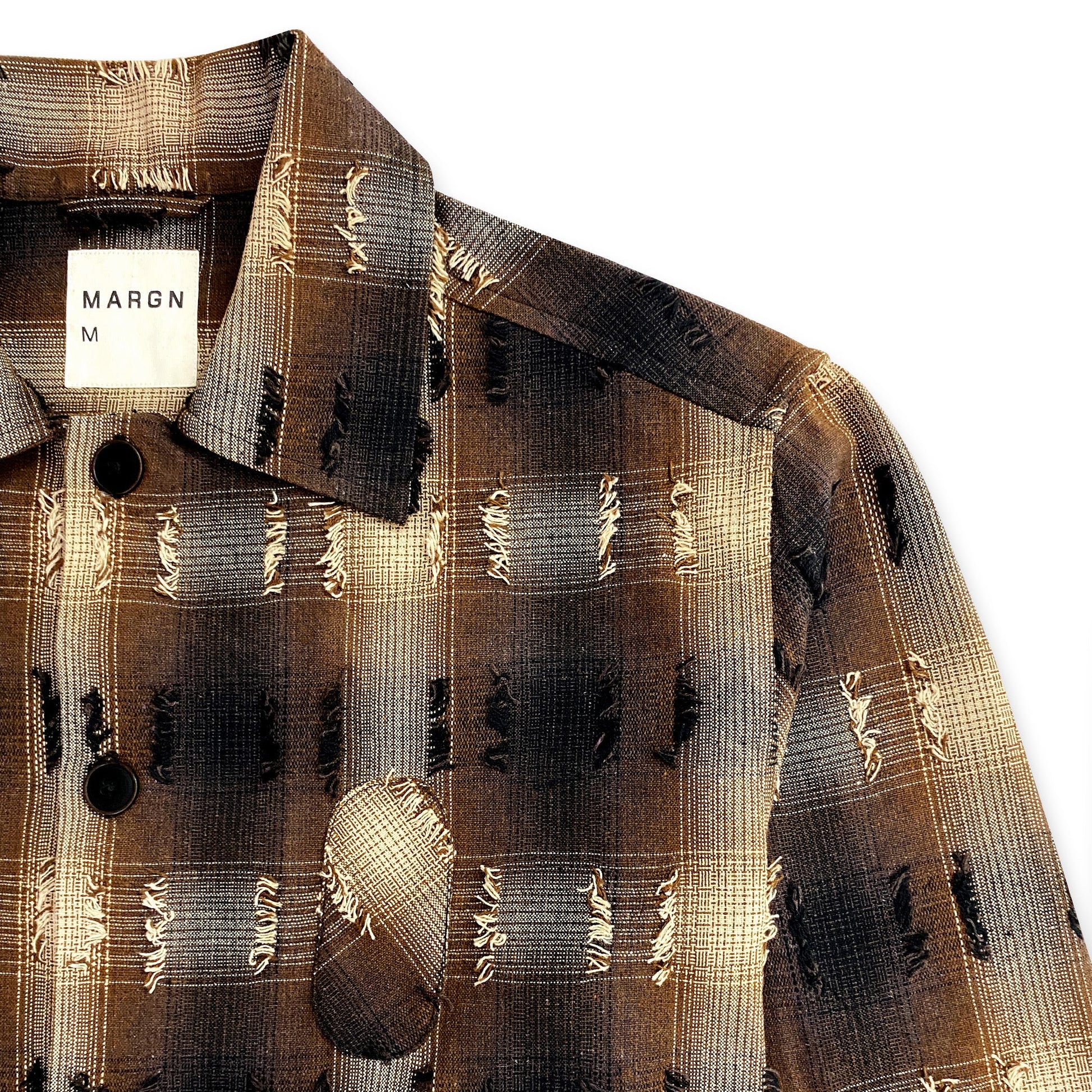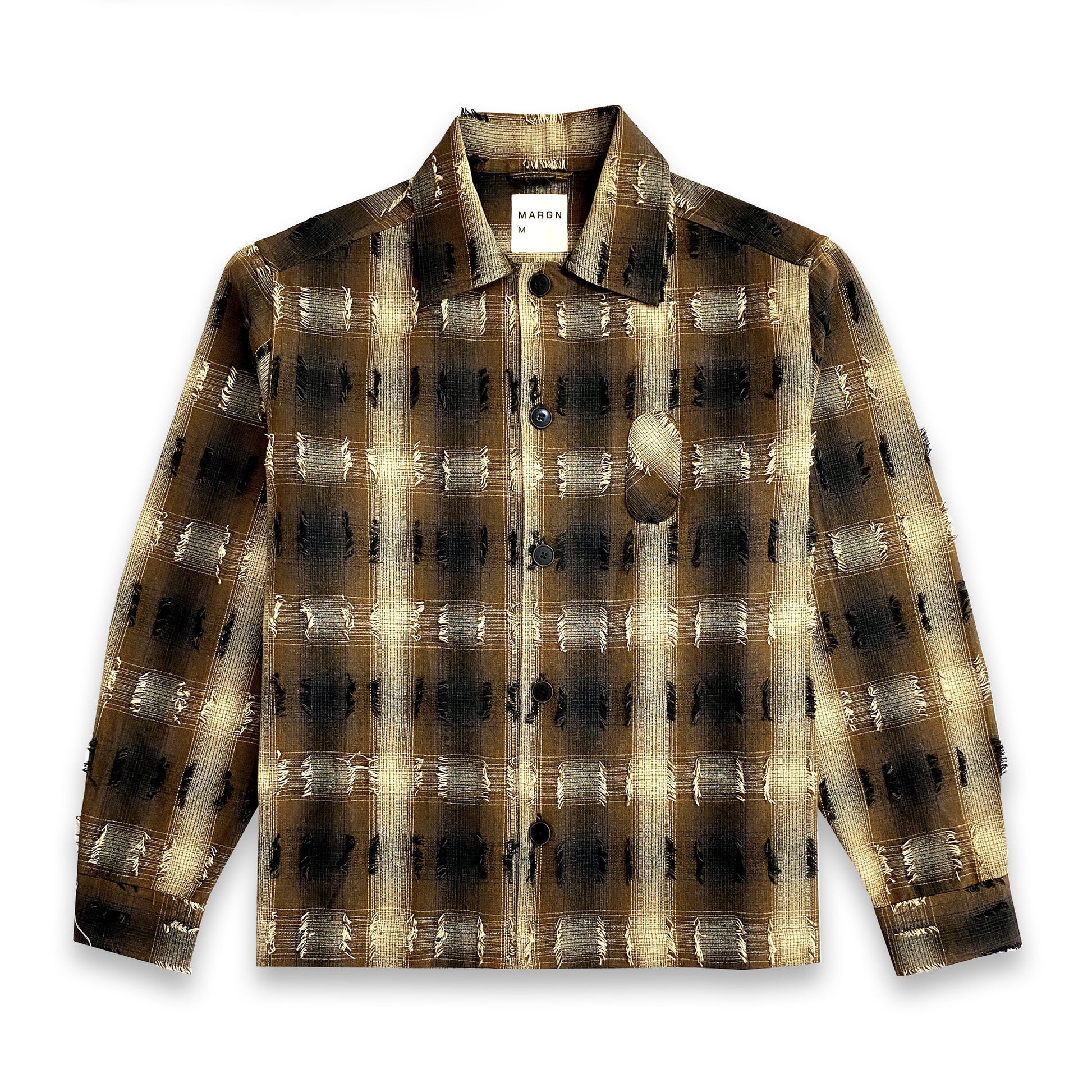 Fray details all over, Ombre checks, Full sleeves, Corozo buttons.