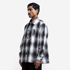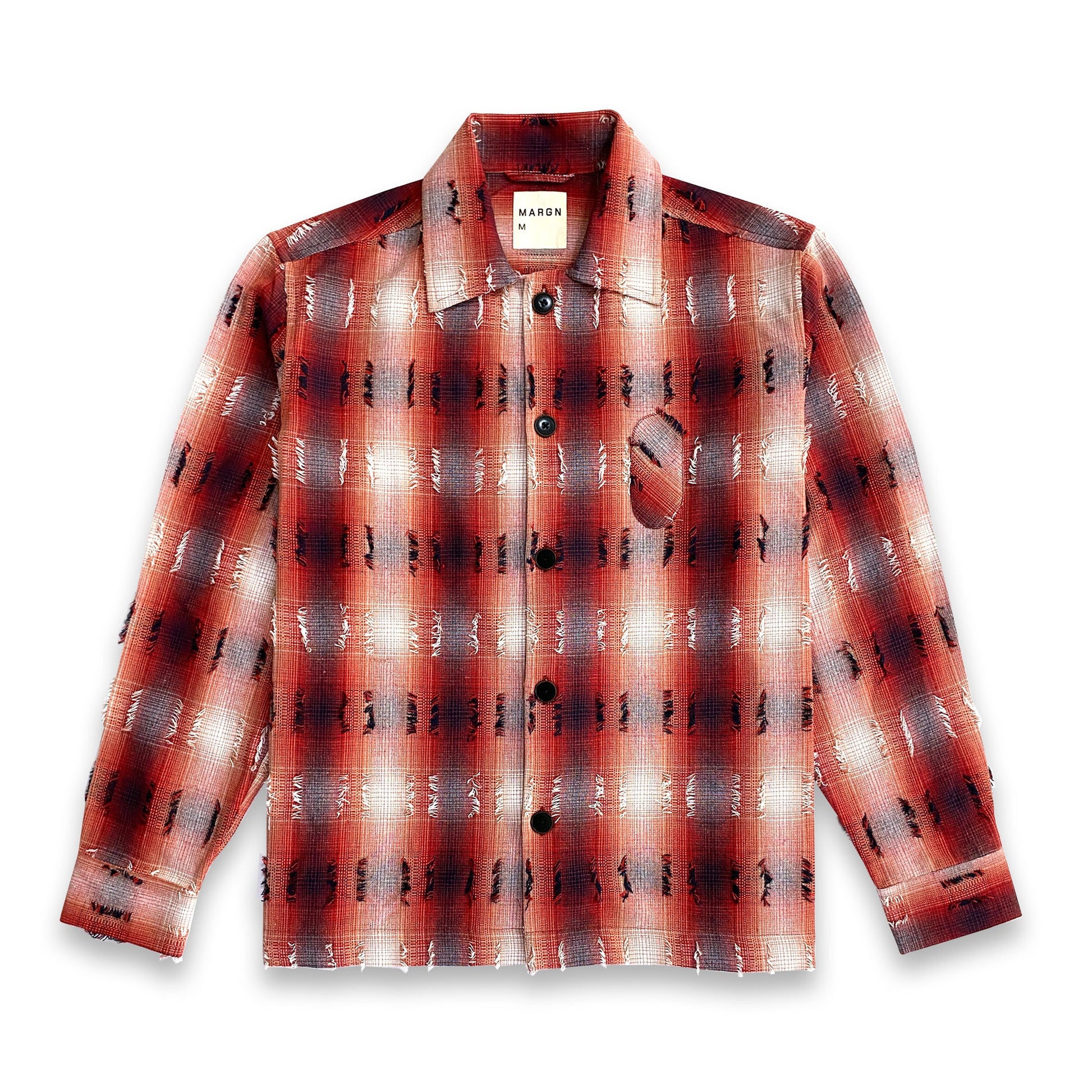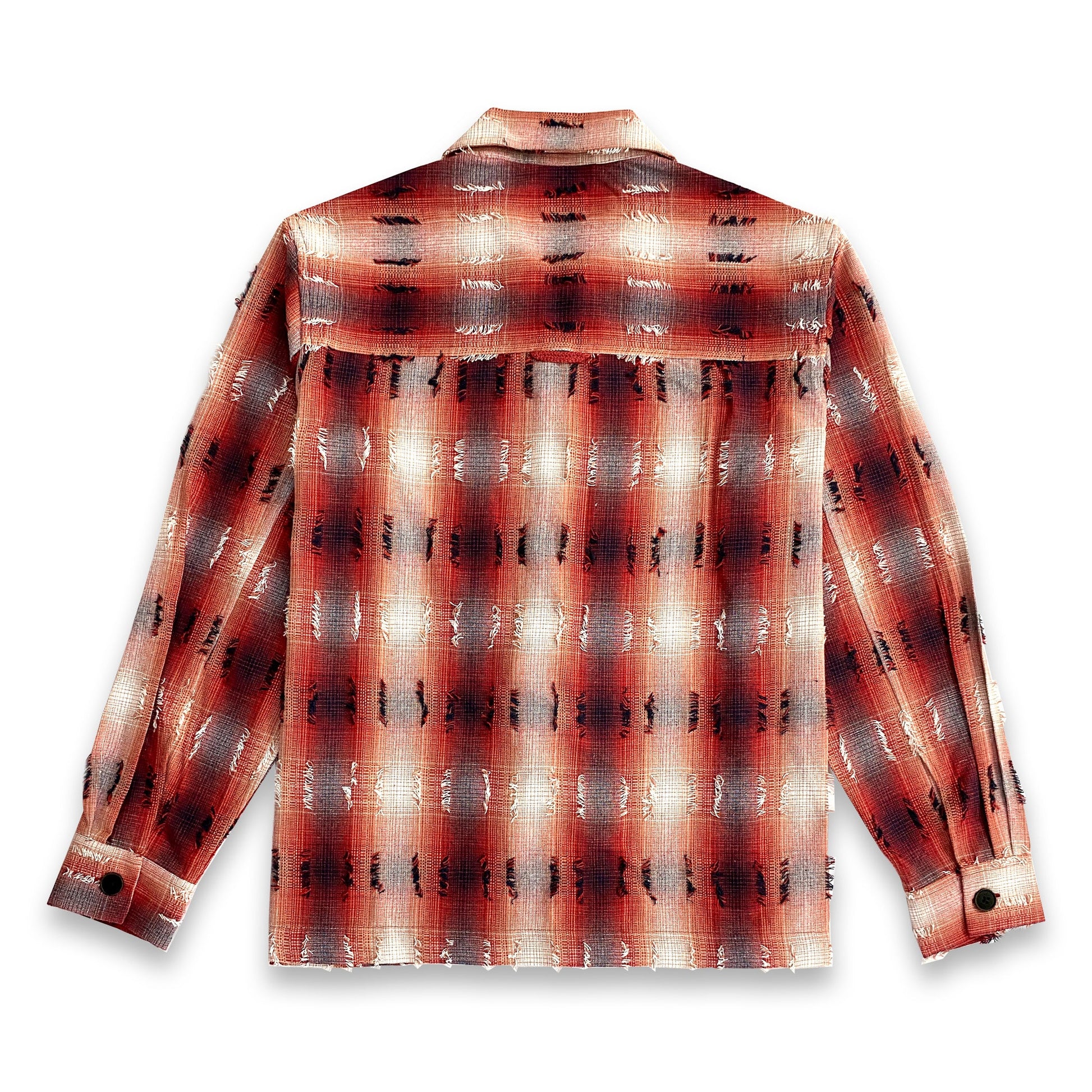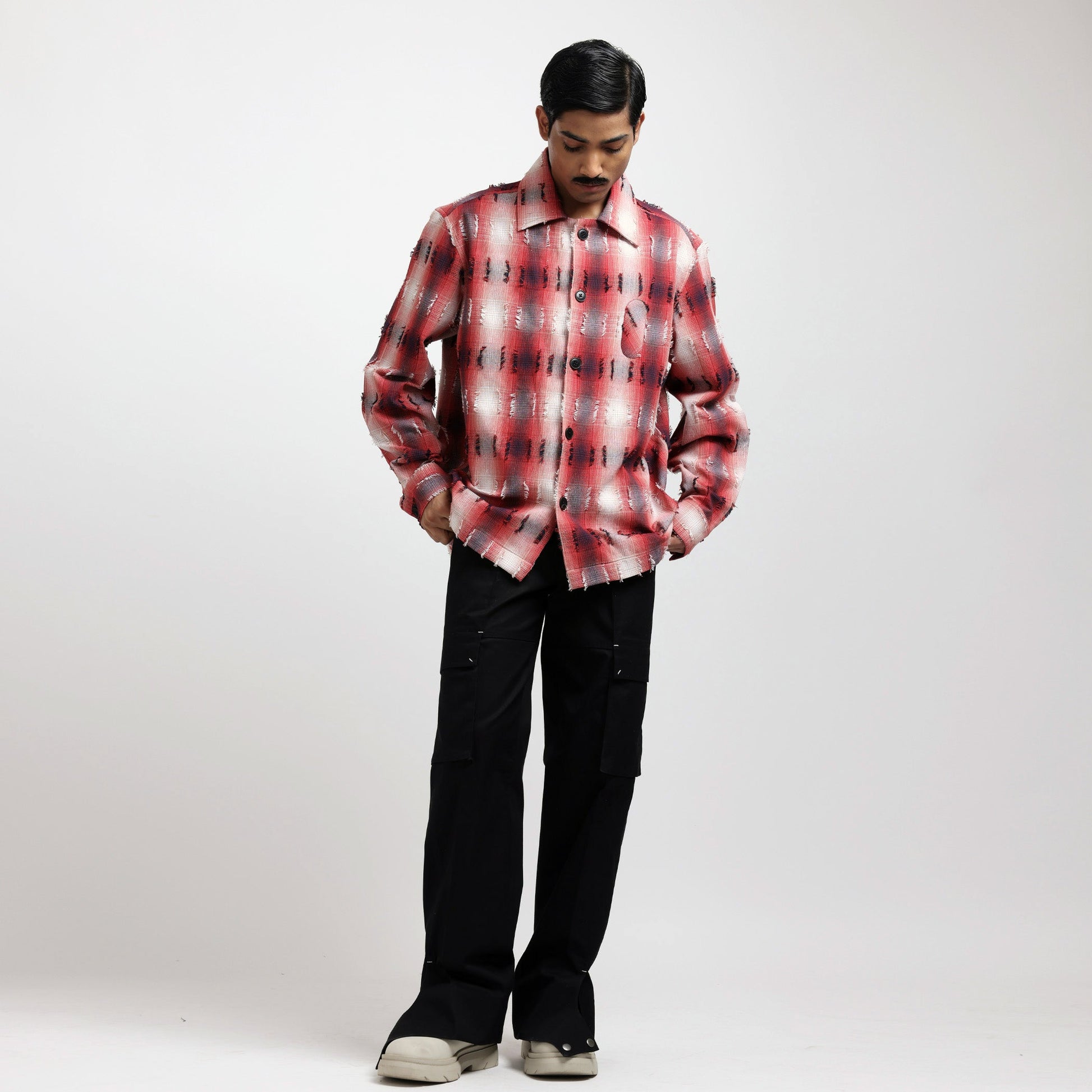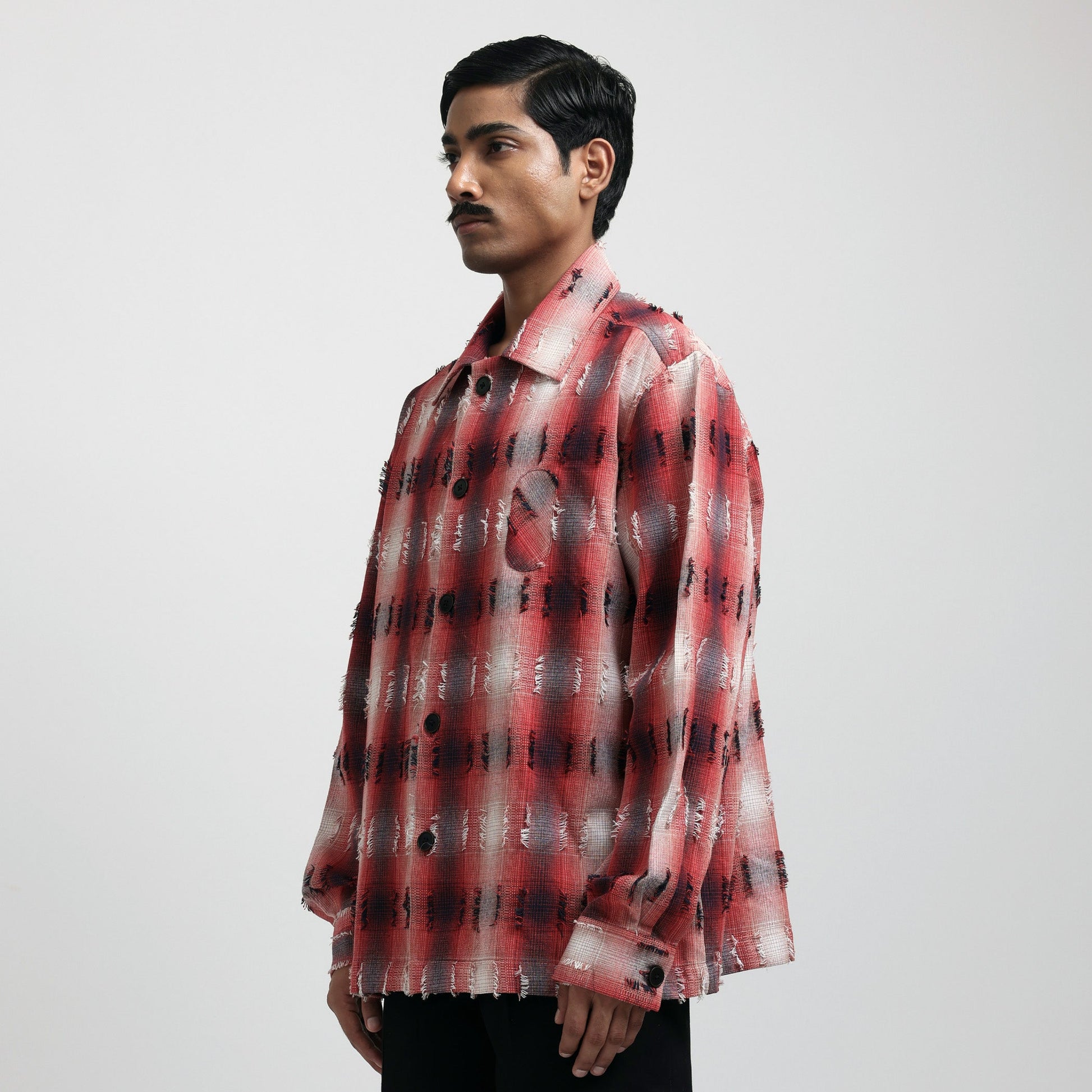 Fray details all over, Ombre checks, Full sleeves, Corozo buttons.