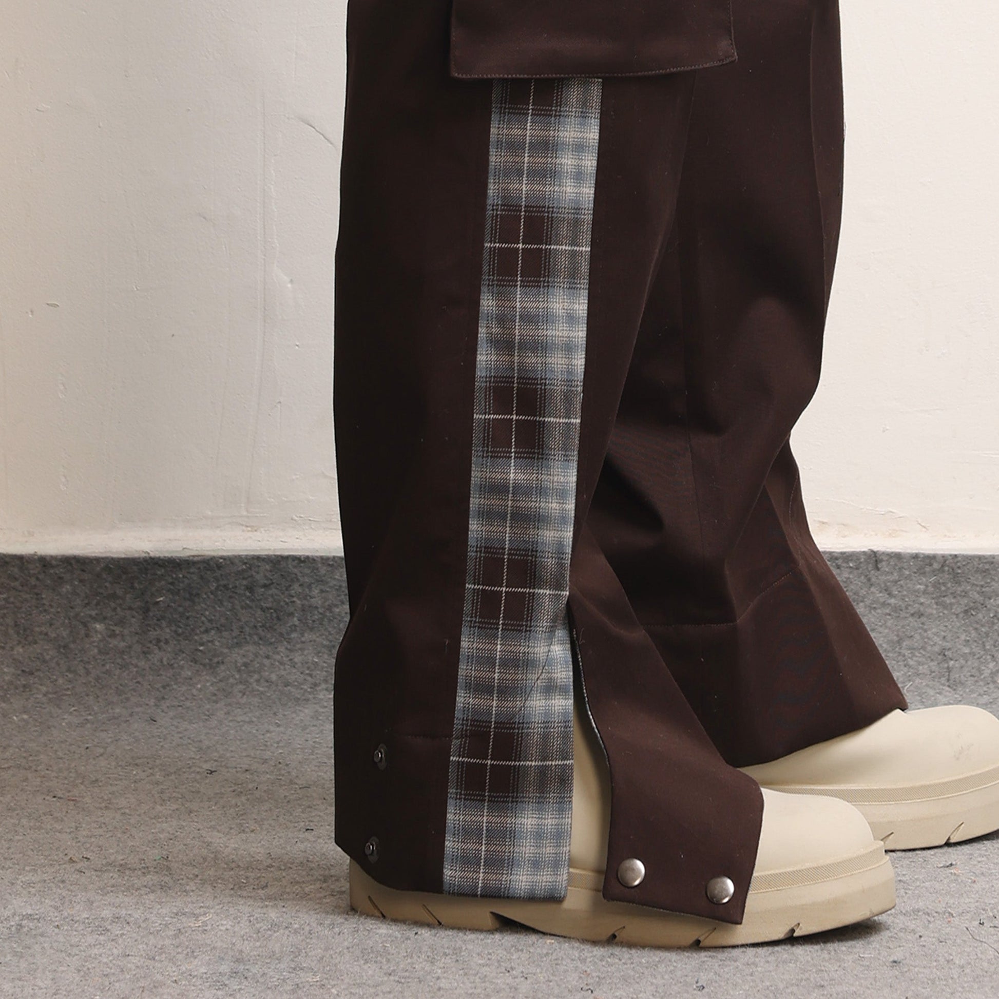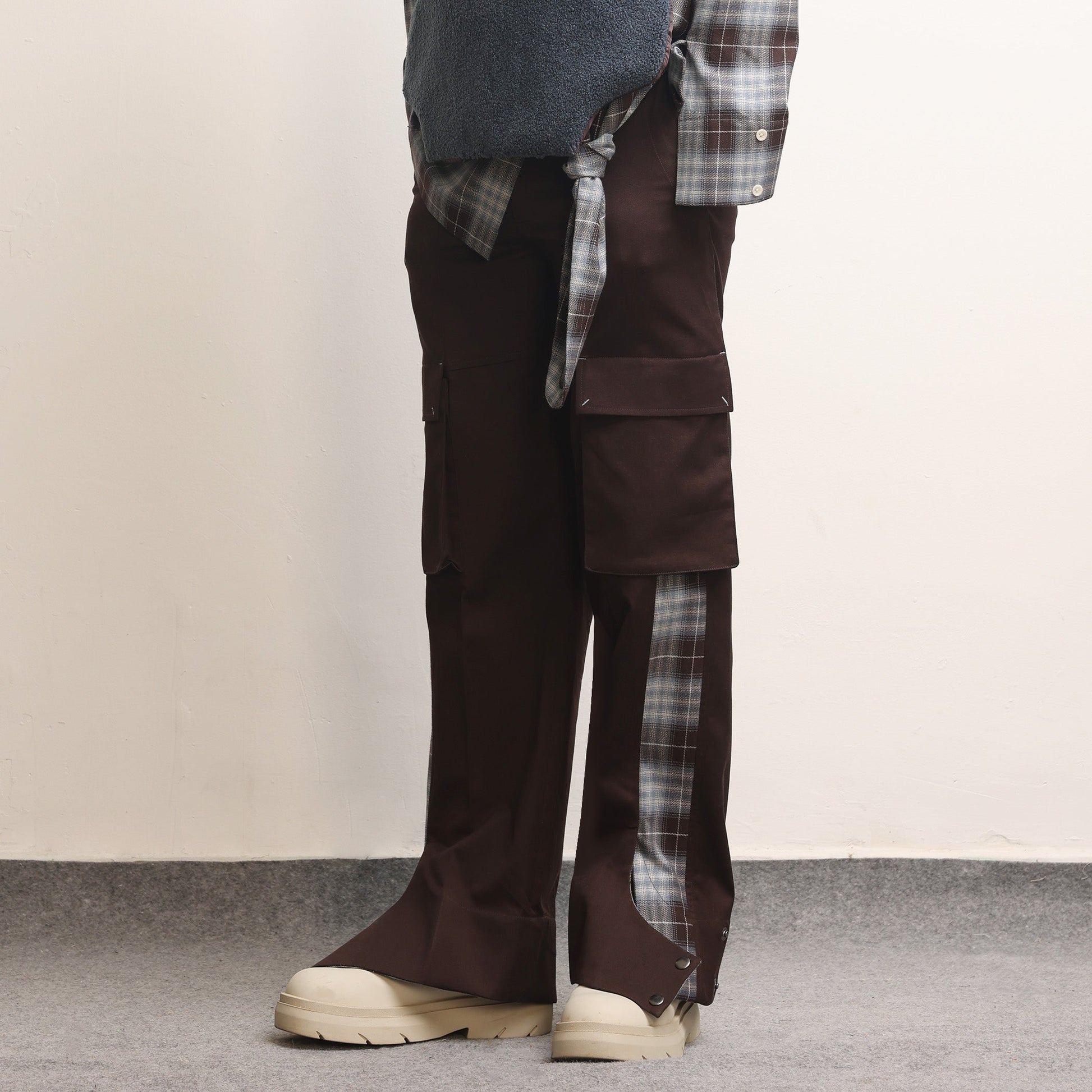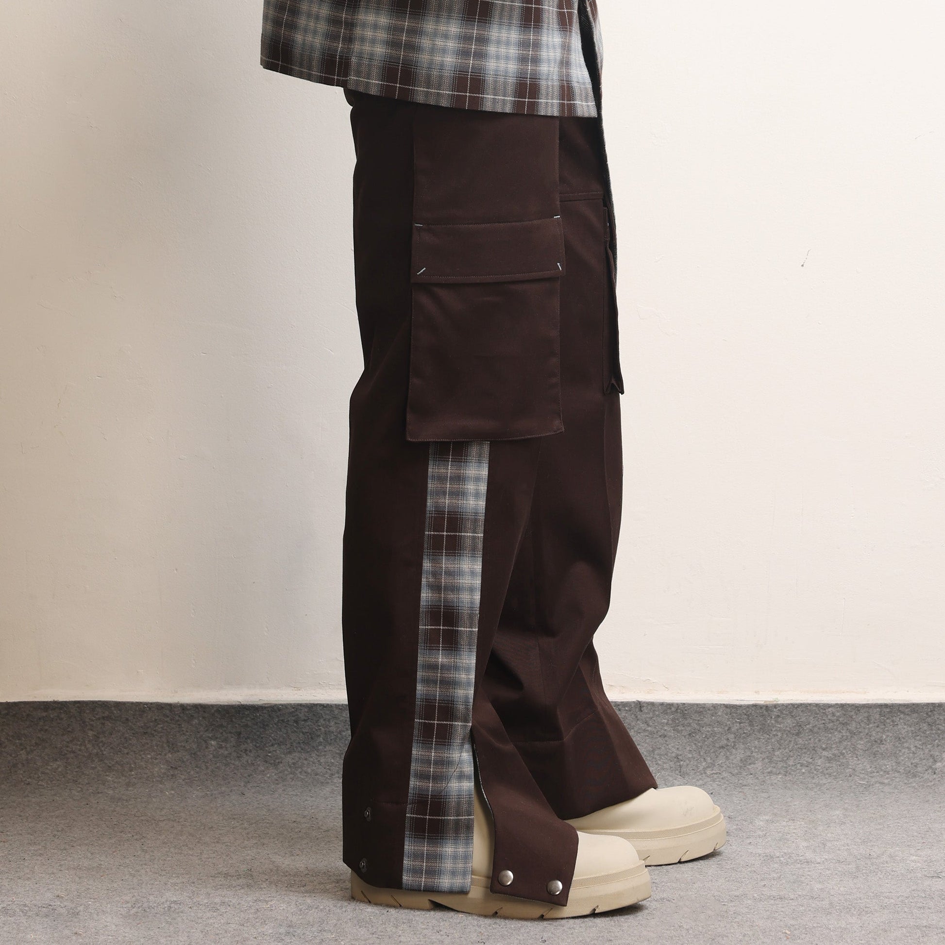 Panelled construction, Continuous pocket detail, Cargo pockets on sides, Bartack details all over, Signature Margn cut at hem with snap buttons.