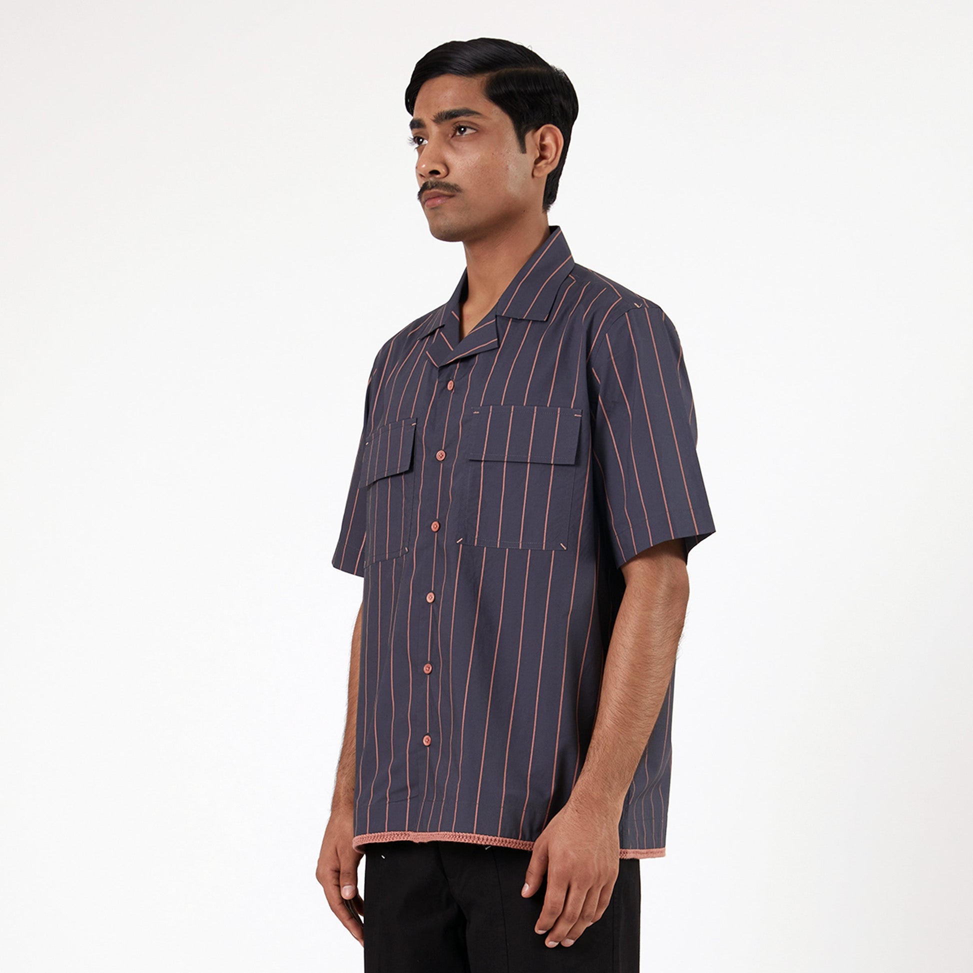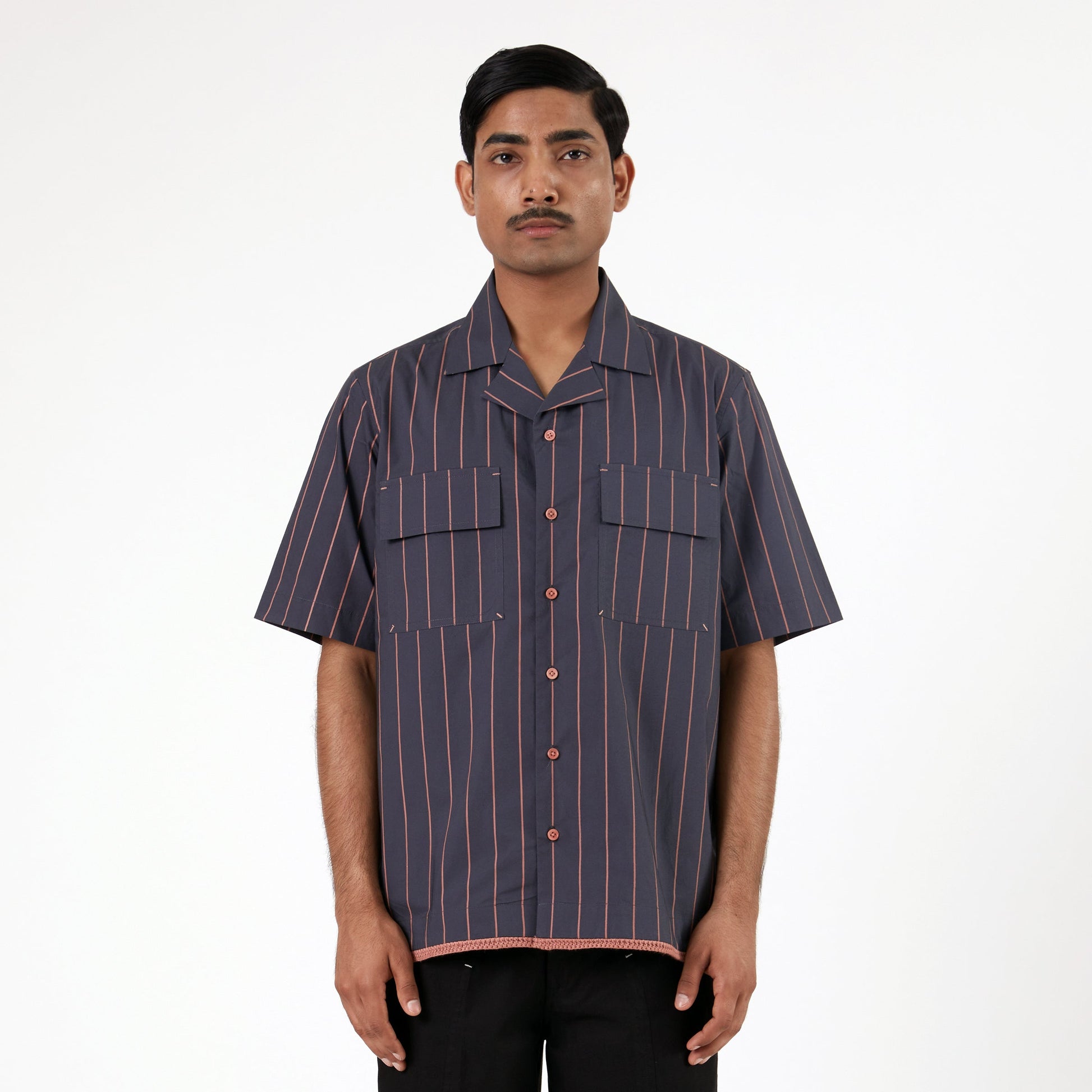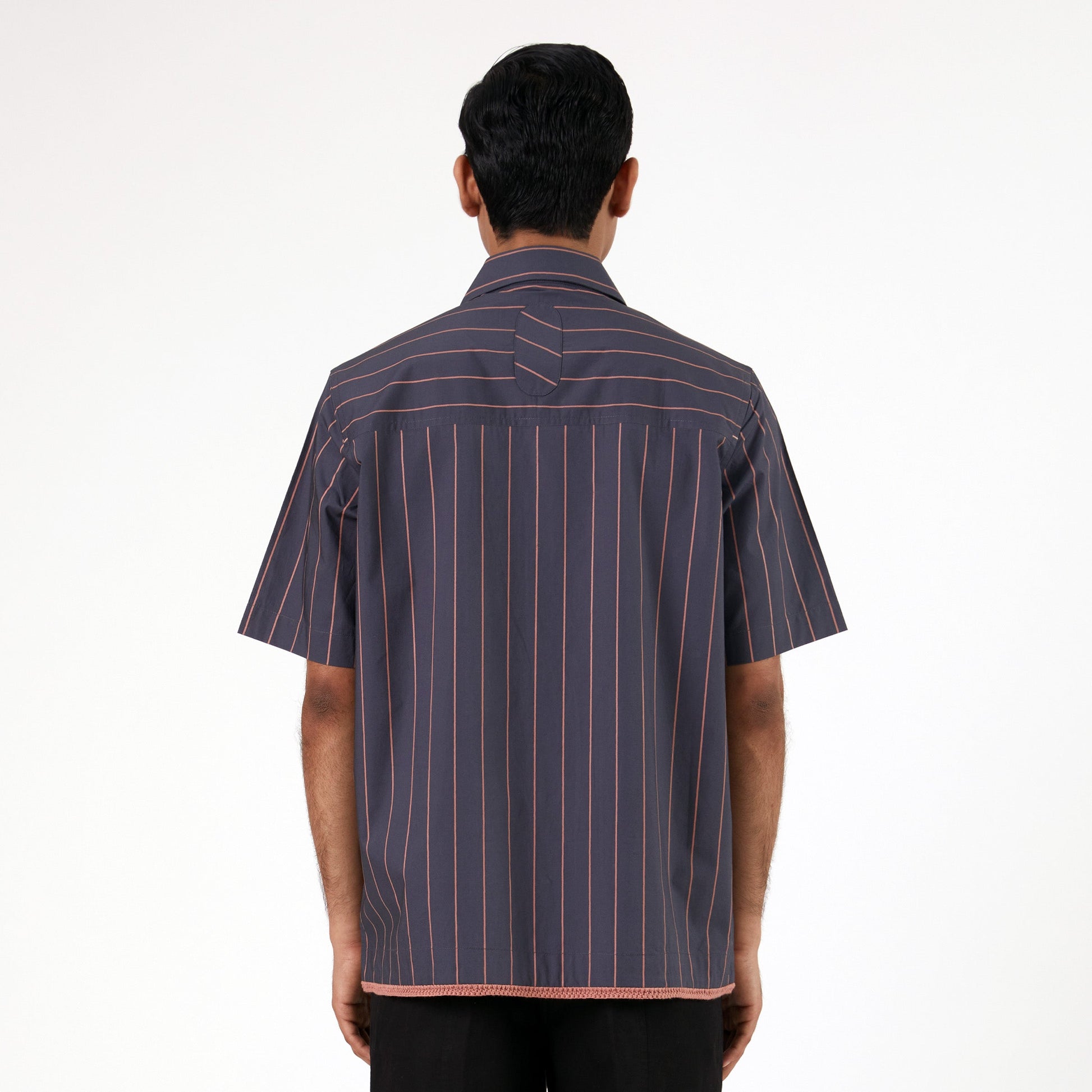 A refined summer essential, the Regiment Striped Shirt reinterprets classic uniform elements with a soft structure and clean lines. Crafted from breathable cotton poplin, it features hand screen-printed stripes, dual chest patch pockets, symbolic bartack accents, and a distinctive crochet stripe detail at the hem. Finished with natural Corozo buttons, the shirt also features our signature human symbol on the ba k yoke in bias cut.