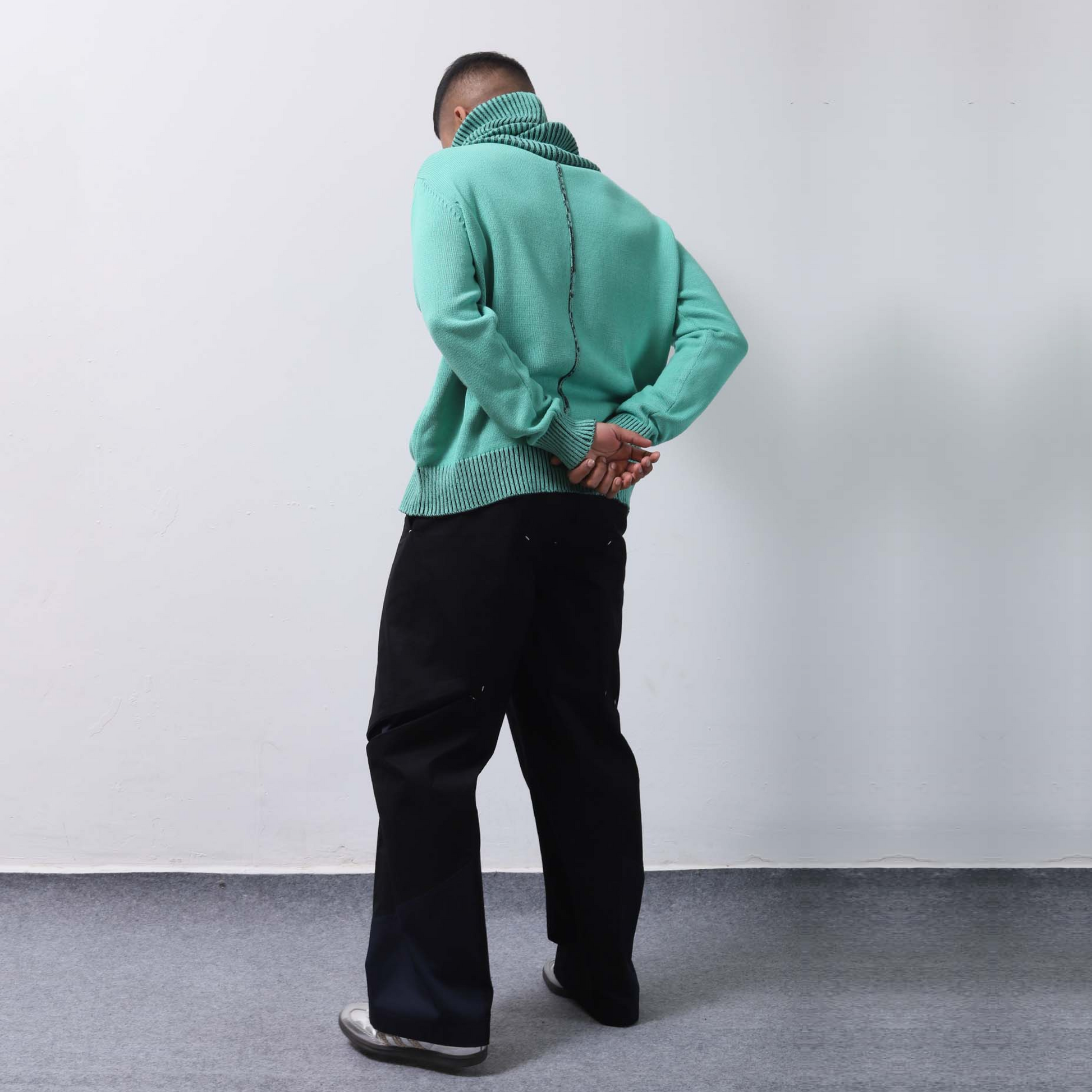 Hand-knitted on Flatbed loom, Pleated contrast details in sleeve and body rib, High neck, Stripe detail in center front and back.