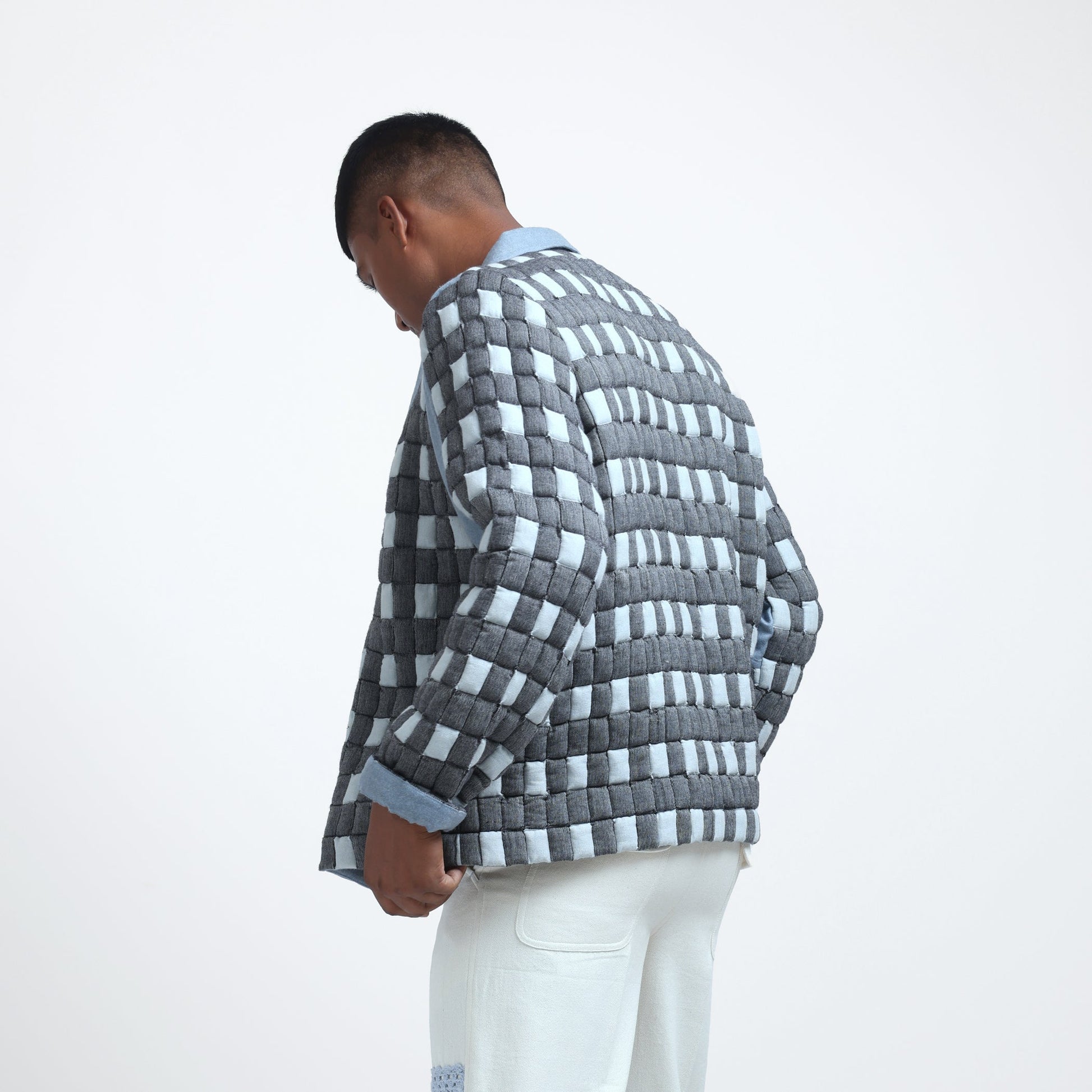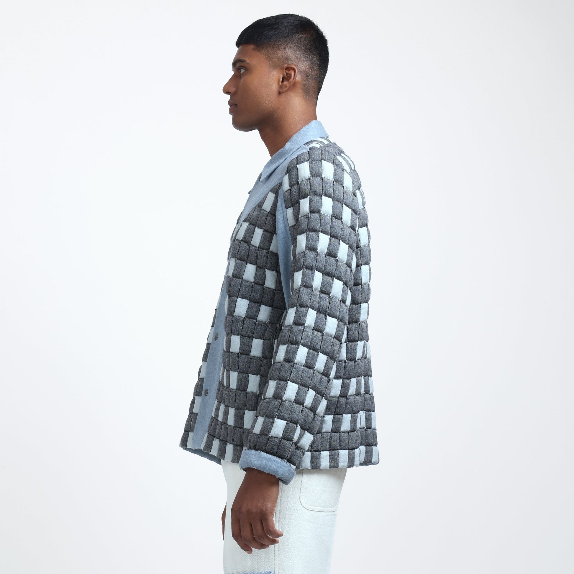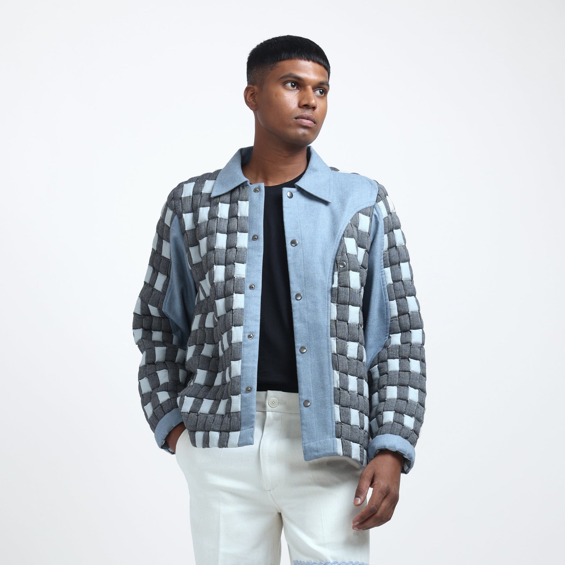 Crafted in collaboration with skilled artisans from Bharuch, Gujarat, the Signature Margn Handwoven Sujani Quilt Jacket combines heritage with modern design. Featuring a checked pattern throughout, the jacket showcases a striking color-blocked front, complemented by the signature Margn cut. A hidden chest pocket with a snap button adds functional style, while the side seam pockets provide added convenience. The snap button closure ensures a tailored fit, and the merino wool blue sleeve panel adds comfort and flexibility, making this jacket a perfect blend of tradition and innovation.