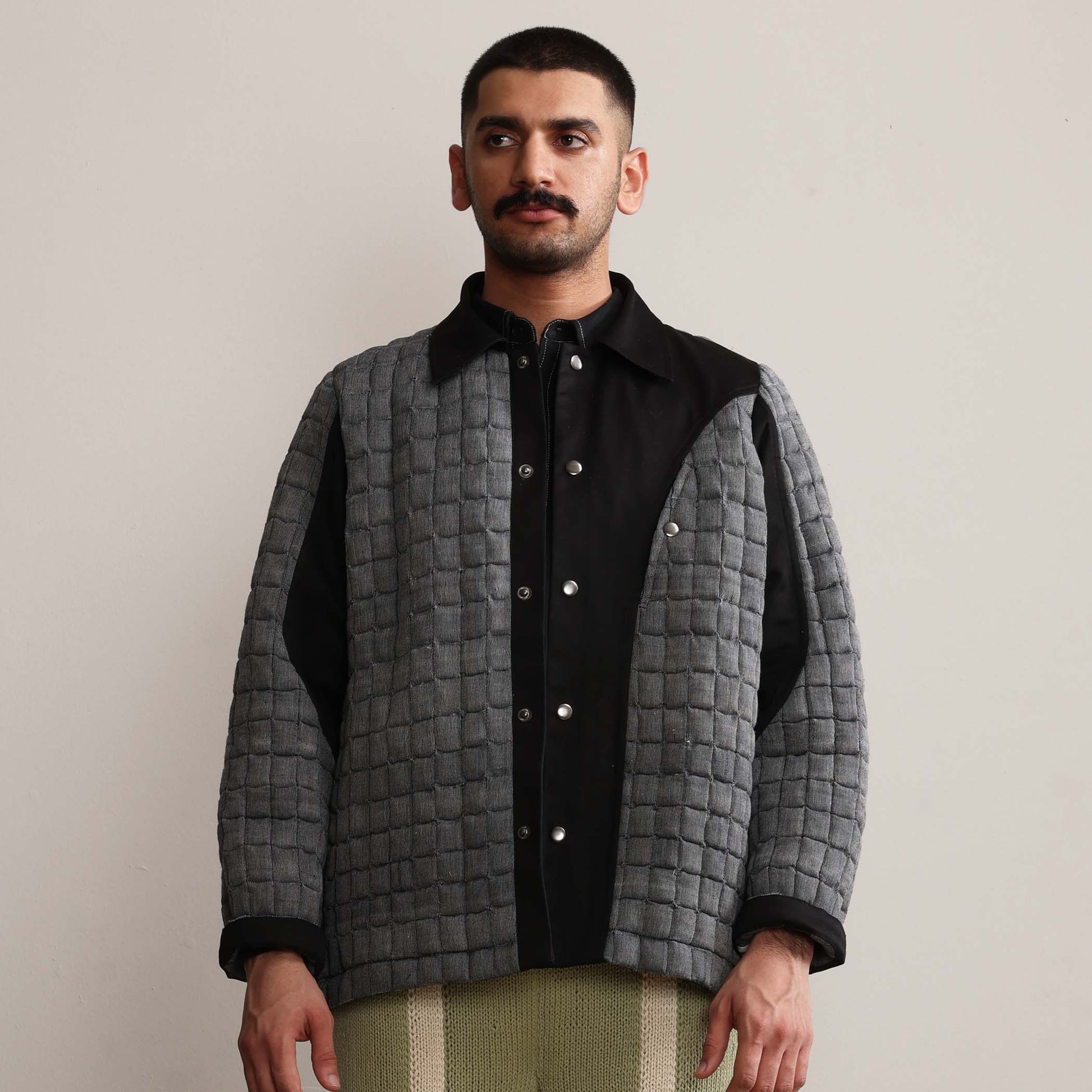 Handwoven quilt jacket with handwoven denim trims in a signature Margn cut in front, Side inseam pockets, Bellow pocket on chest, Snap buttons fastening, Sleeve hem fold.