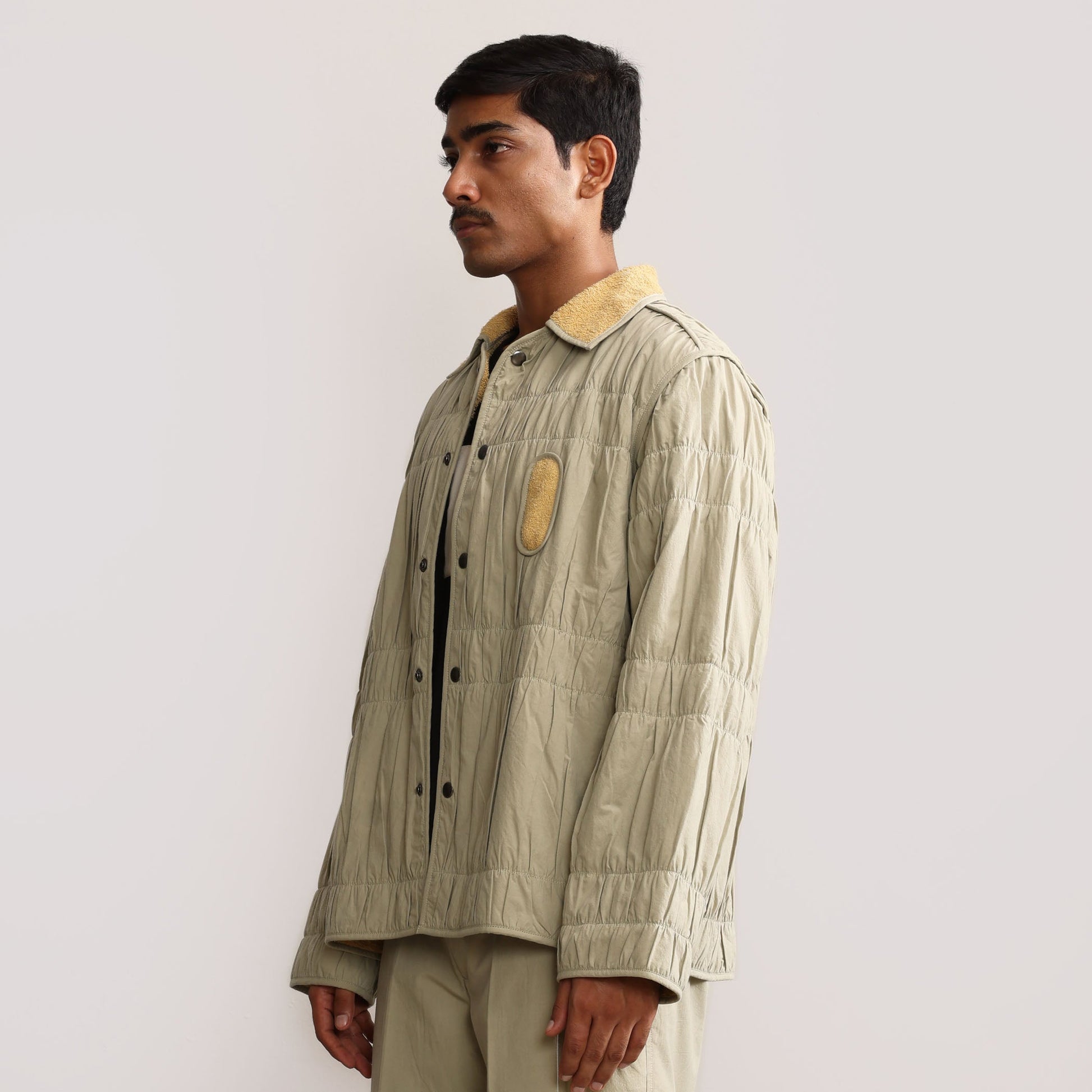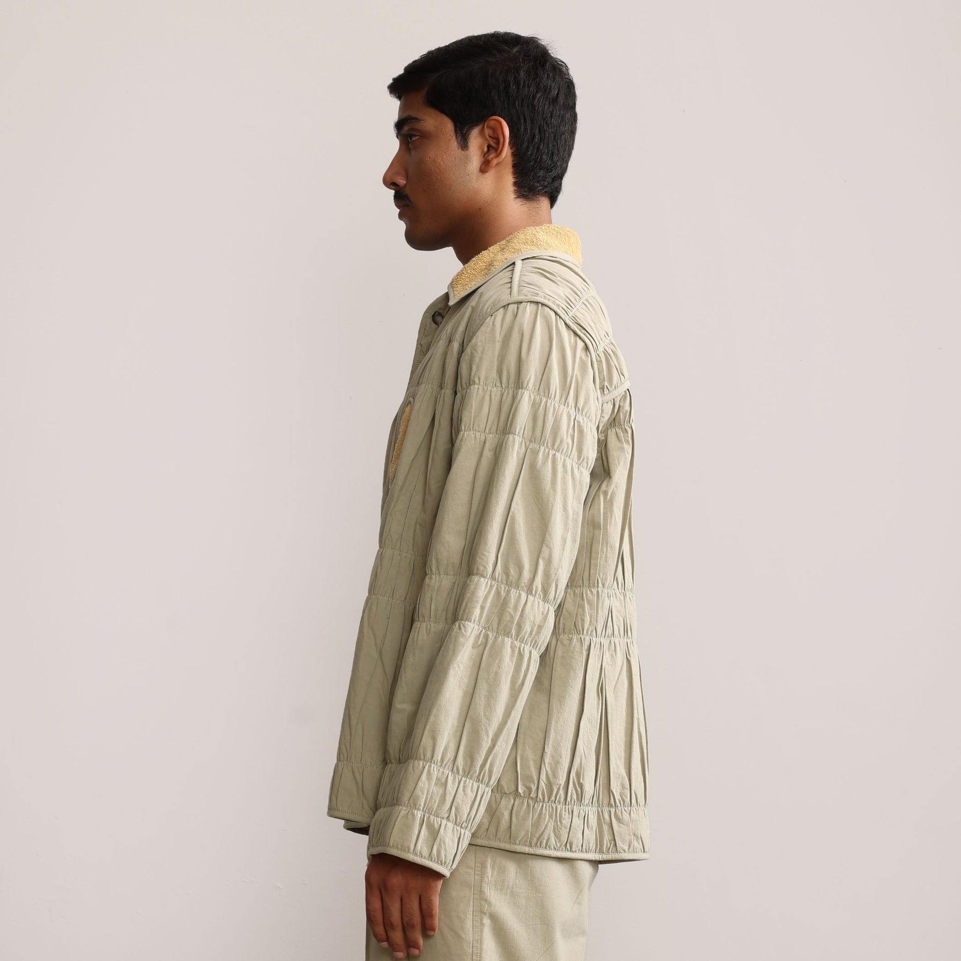 Margn signature wrinkle effect on the shell fabric, Natural dyed cotton terry lining, Edges finished with binding, Human symbol in front.