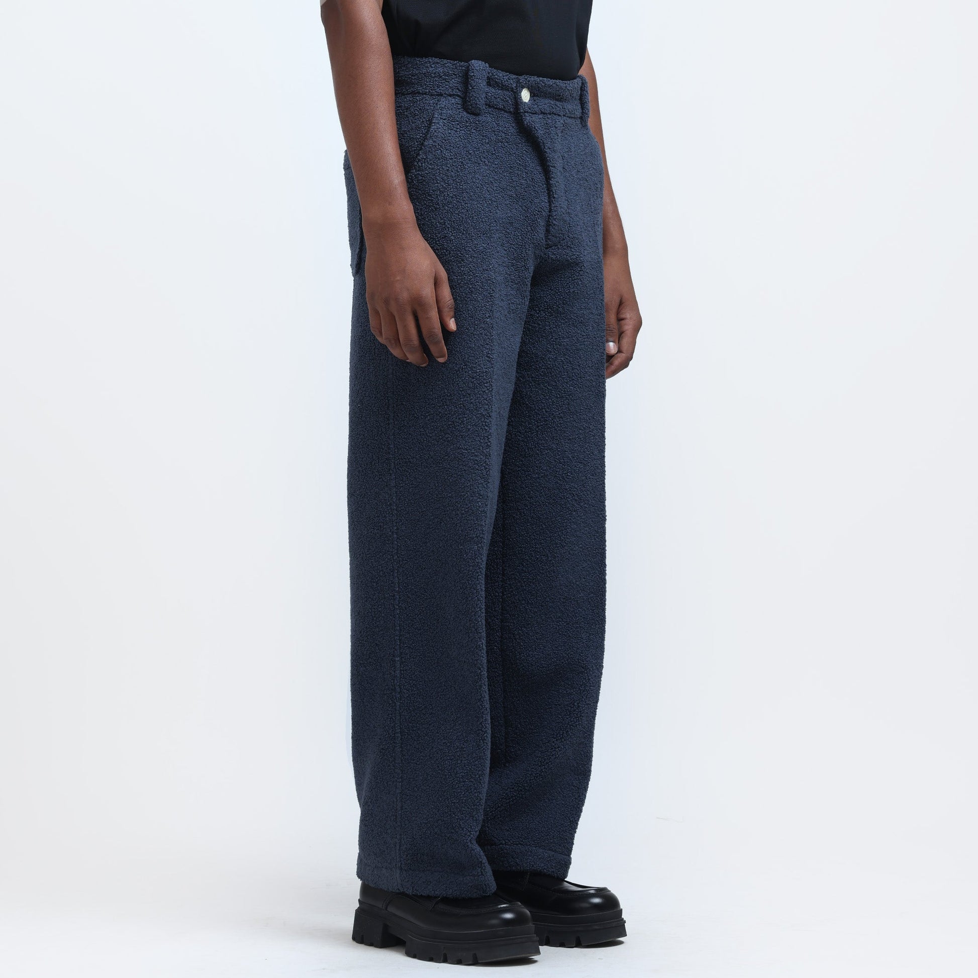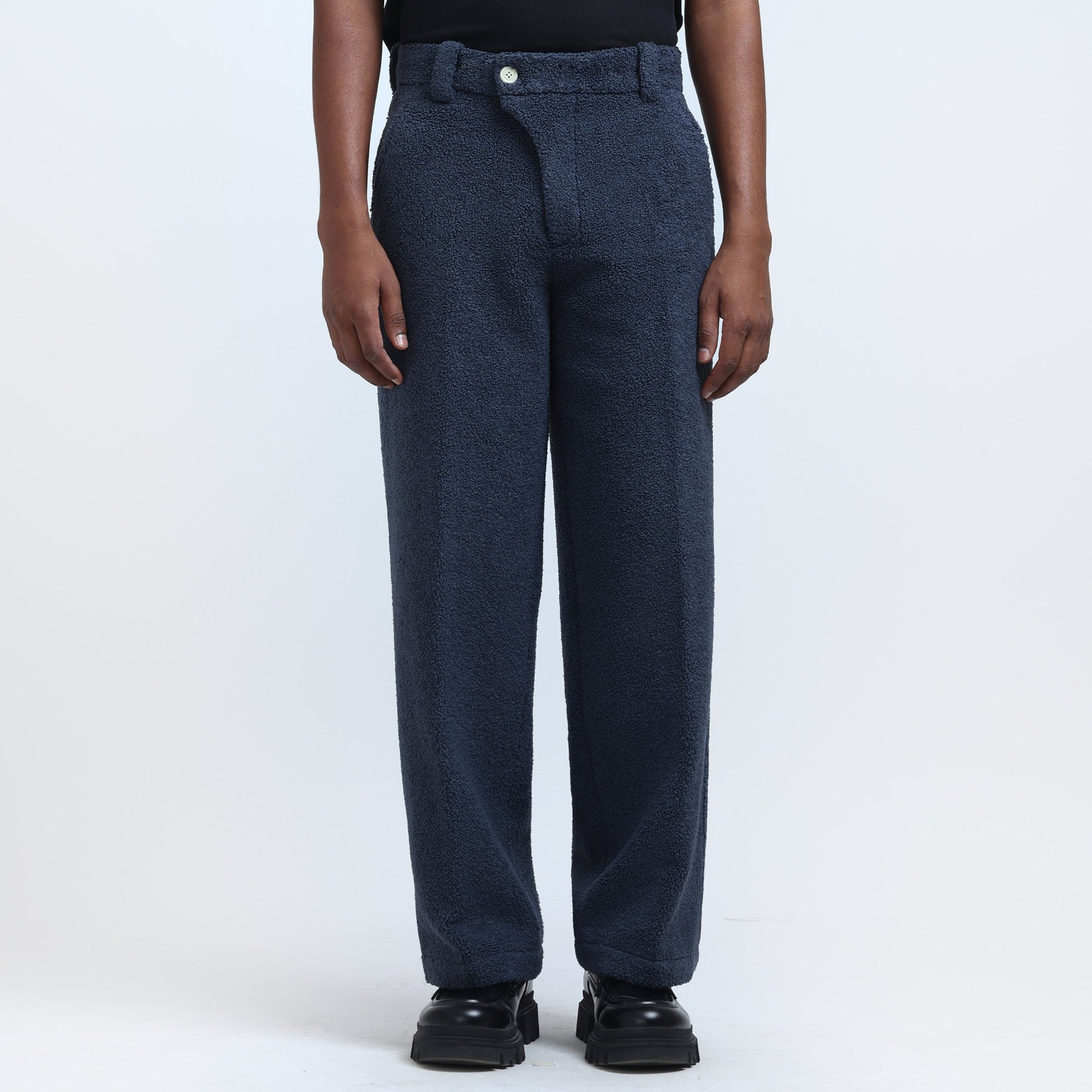 Elevate your wardrobe with these textured boucle trousers, featuring a signature cut at the waist and fly zip. Designed with a relaxed fit silhouette, they offer both comfort and style. The unique texture adds a refined touch to your everyday essentials. Pair them easily with your essential tops for a sophisticated, clean look.
