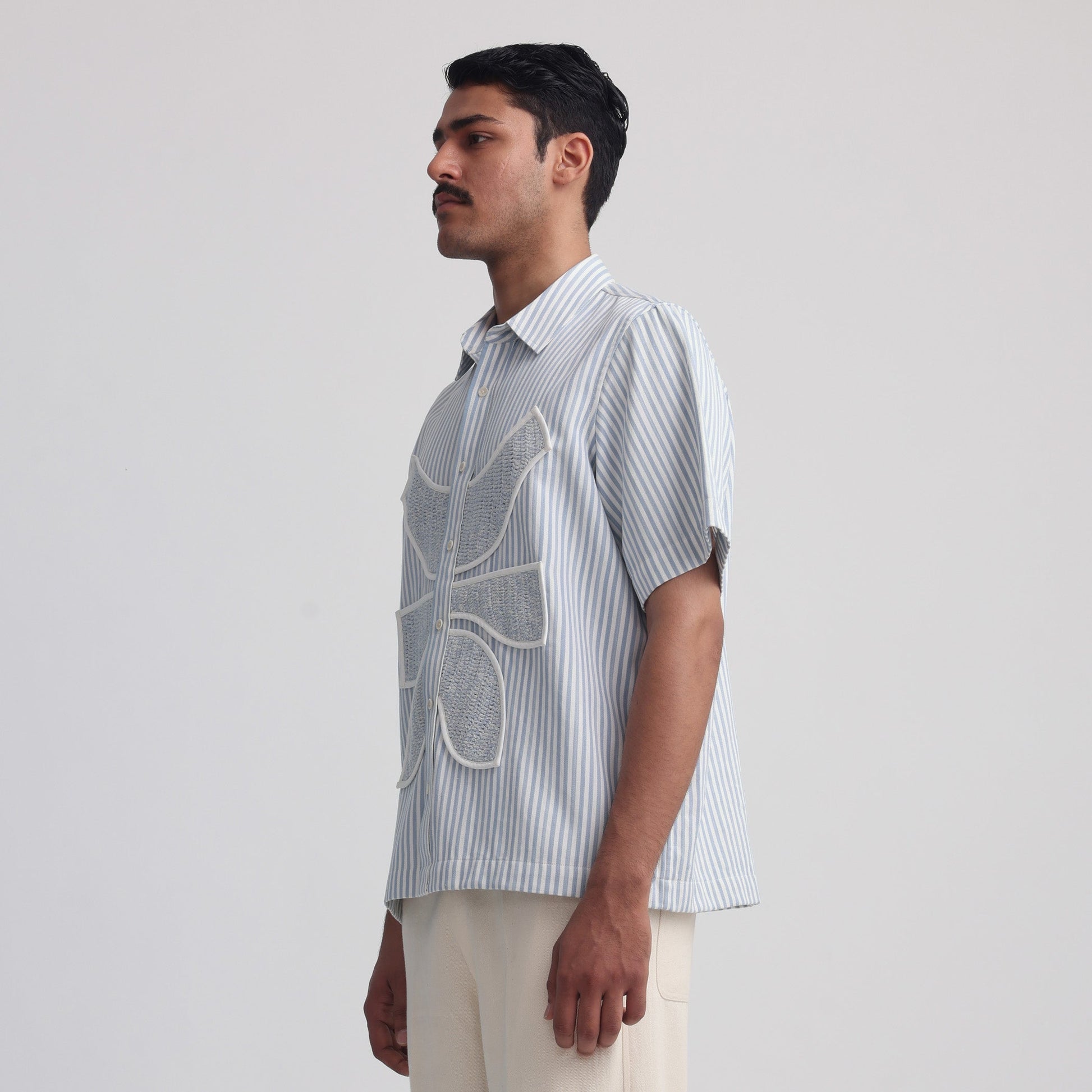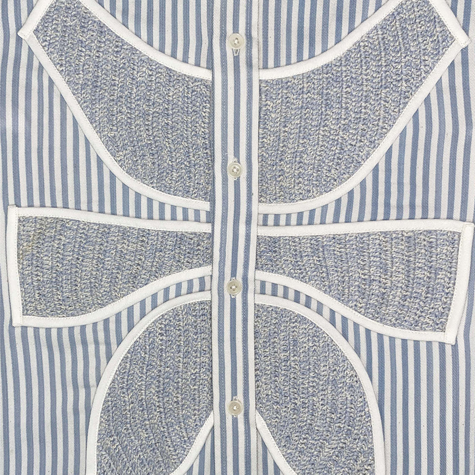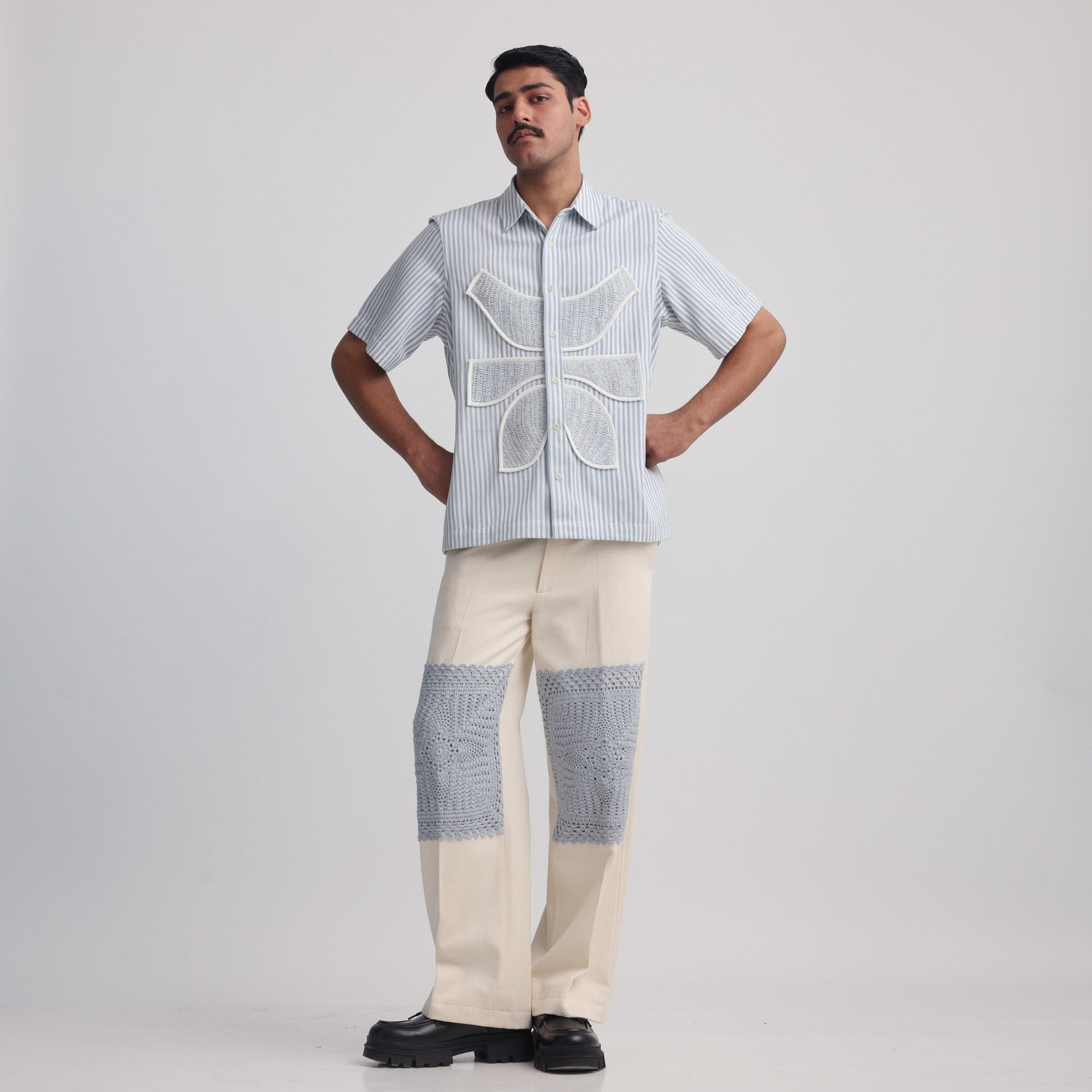 Hand crocheted symbolic applique work finished with binding, Half Sleeves, Oxford Collar, Corozo buttons.