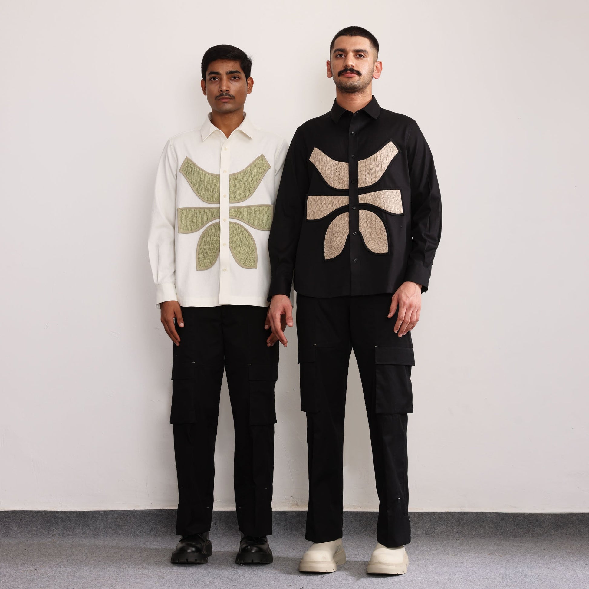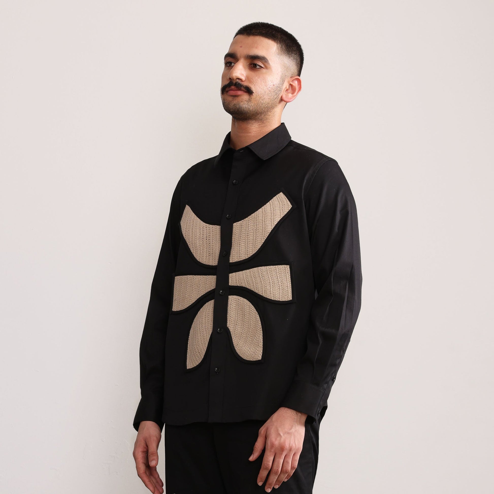 Hand crocheted beige symbolic applique work finished with binding, Full Sleeves, Oxford collar, Corozo buttons.